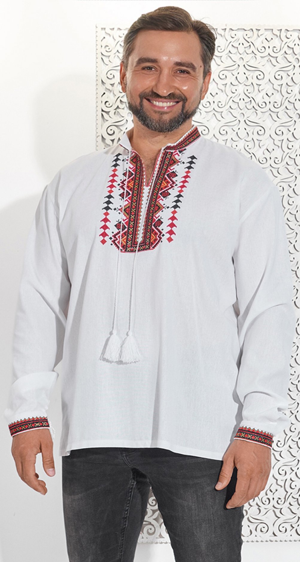 * Вишукана вишивка: Унікальний геометричний візерунок у червоних та чорних тонах прикрашає комір, манжети та передню частину вишиванки. Він надає їй особливого шарму і виділяє з натовпу.