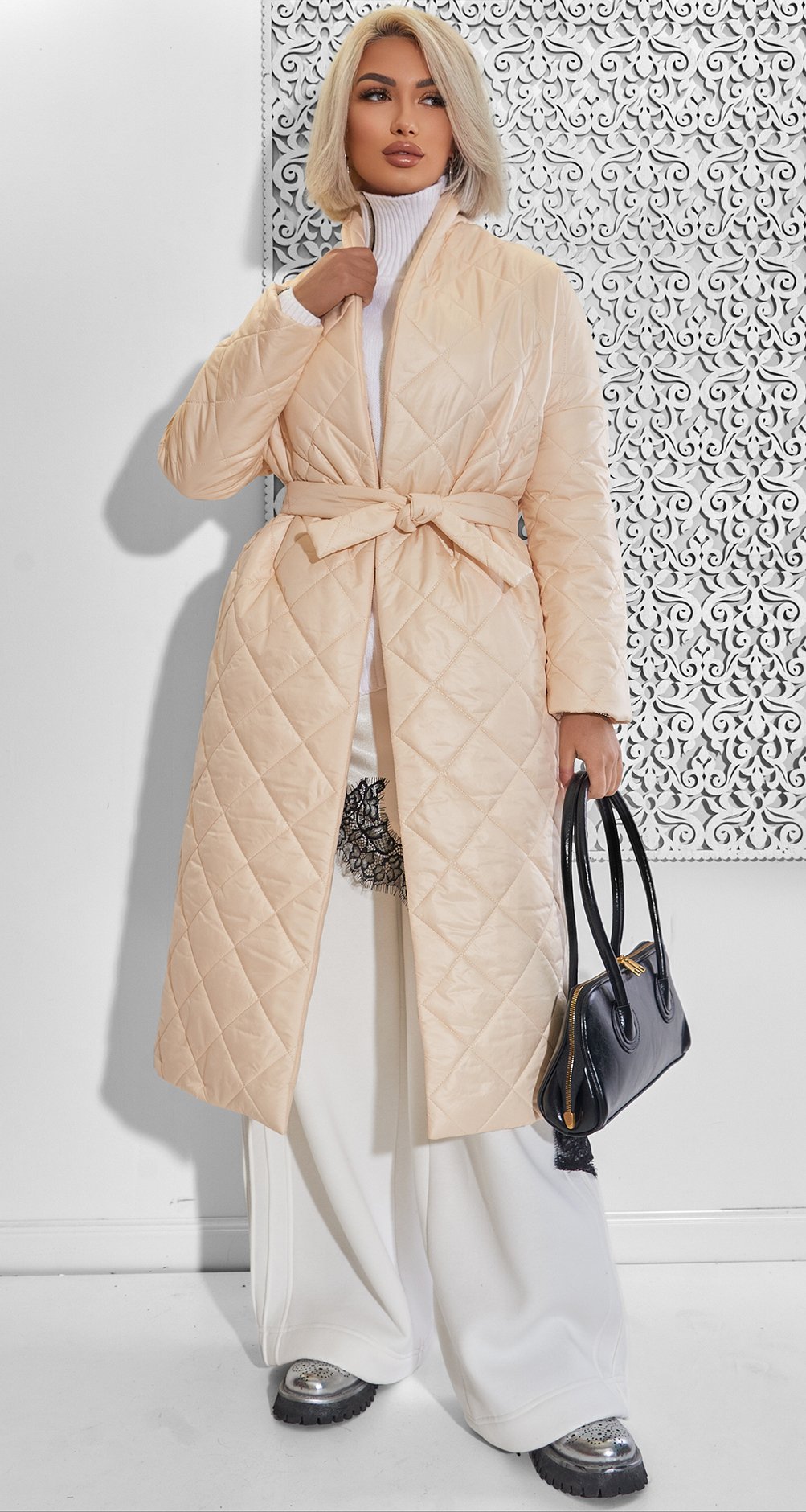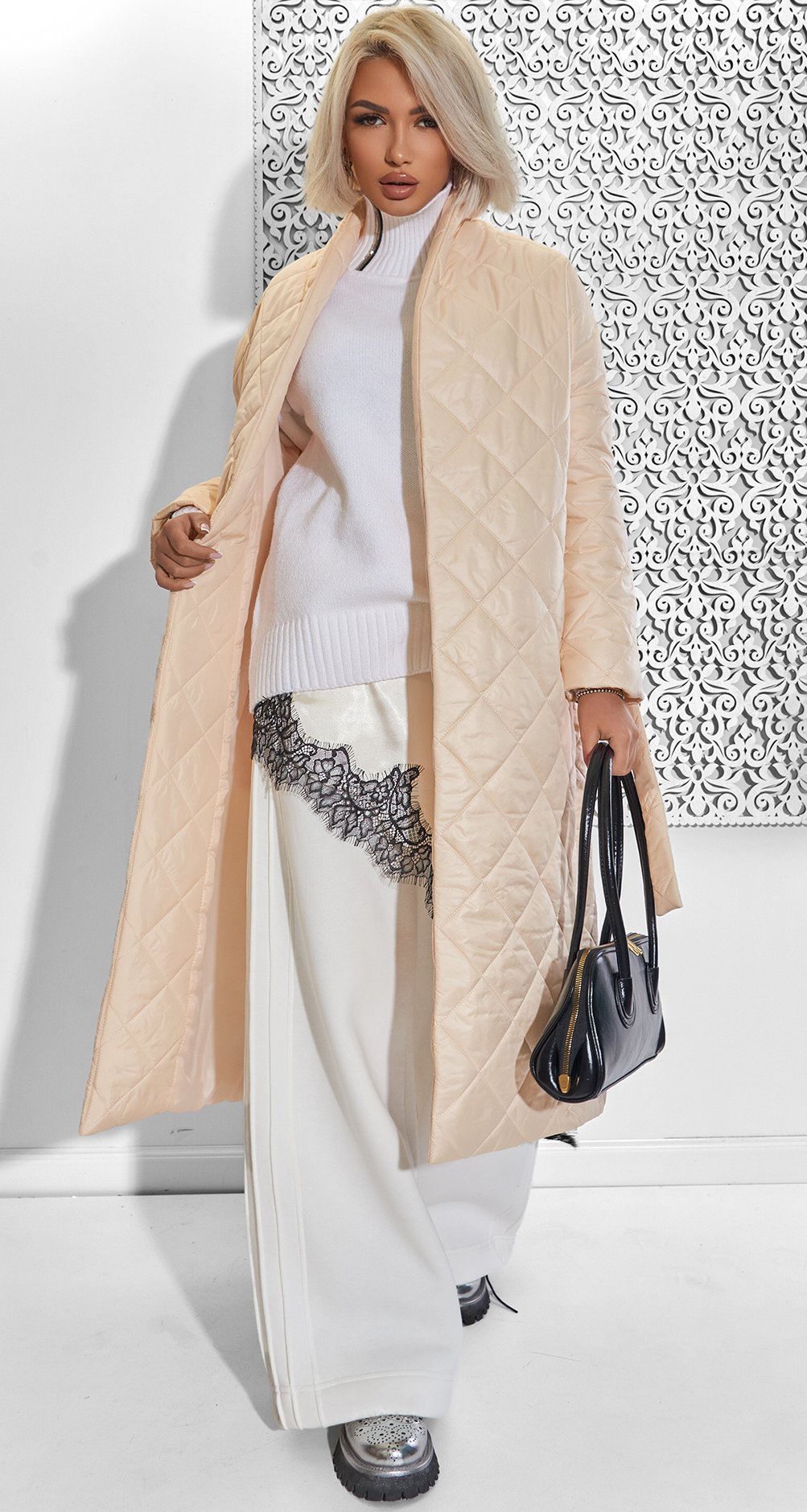 Невагомий комфорт: Завдяки дрібній ромбоподібній стібці та сучасному наповнювачу, пальто практично не відчувається на плечах, але при цьому відмінно тримає тепло.