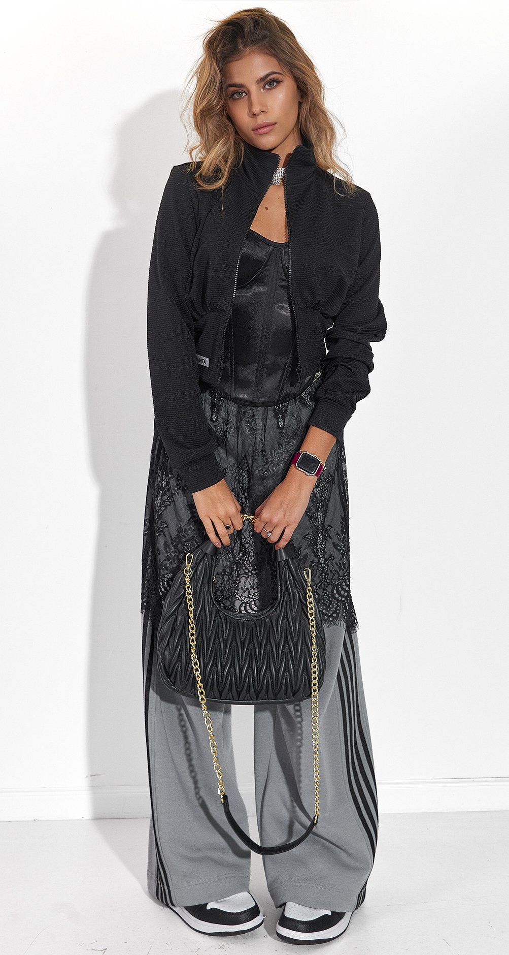 ‚Забудь про нудний трикотаж. Наш укорочений зип-топ зроблений з нереально вайбової фактурної тканини - вона і виглядає дорого-багато, і відчувається максимально комфортно. Кроп-довжина ідеально залітає під високу посадку: джоггер, карго або навіть твої улюблені палаццо.