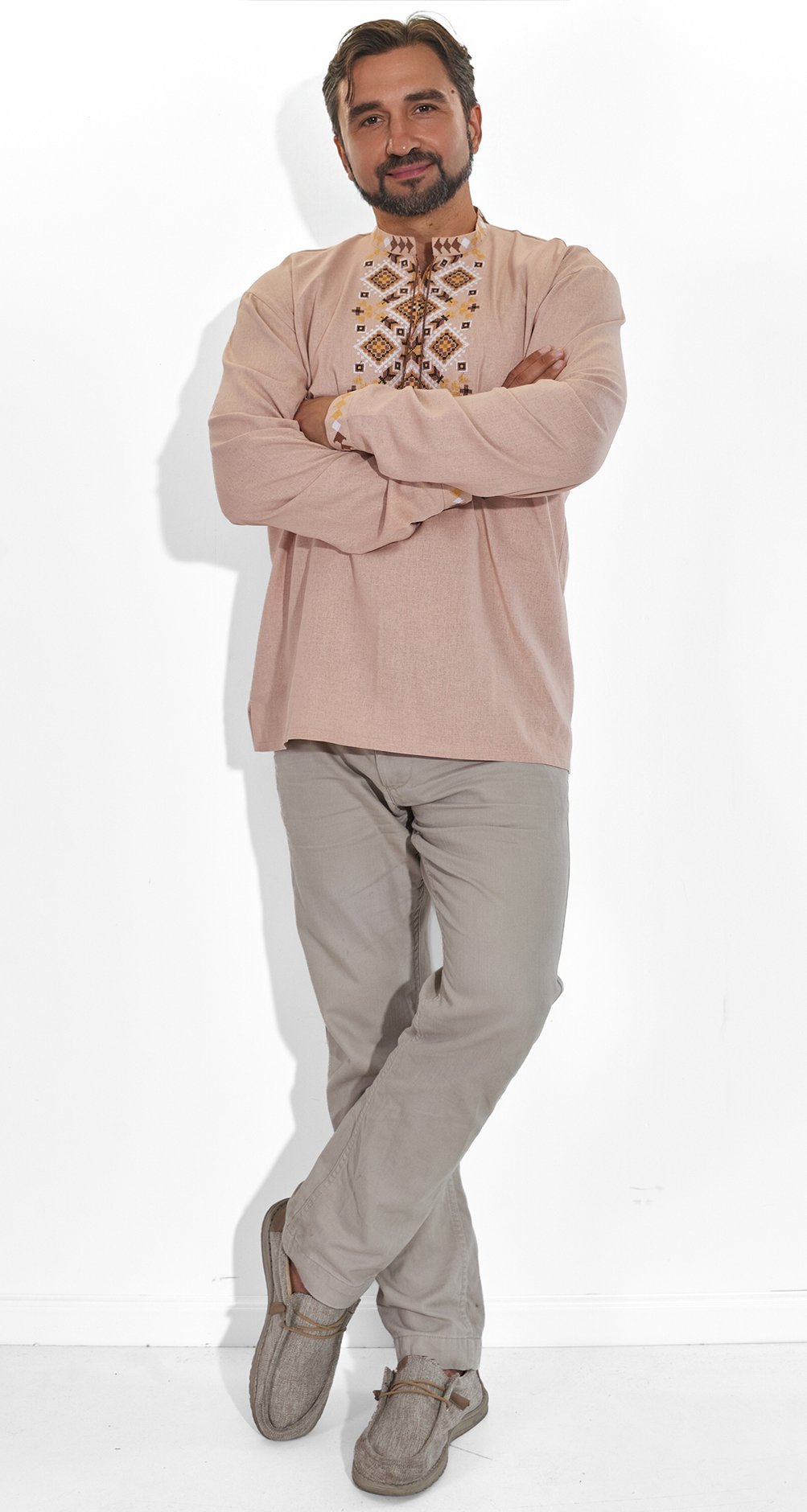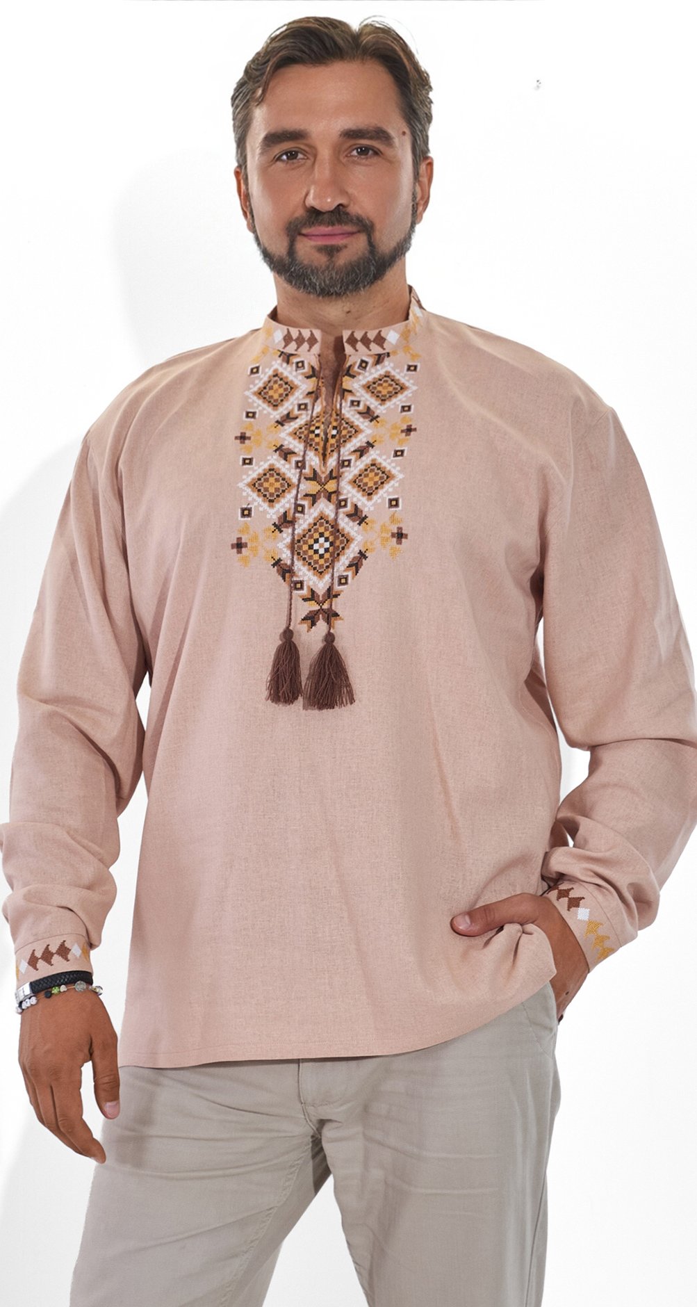 Ця лляна чоловіча вишиванка виконана зі 100% натурального льону, що робить її легкою, дихаючою та ідеальною для будь-якої пори року. Класичний крій та довгі рукави забезпечують зручність, а вишукана геометрична вишивка, натхненна стародавніми слов'янськими візерунками, надає образу особливого стилю та глибини. Вишивка виконана в теплих коричневих, бежевих та золотистих тонах, що символізують родючість, сонце та силу. Додаткова деталь - пензлики на комірі, які підкреслюють автентичність виробу.