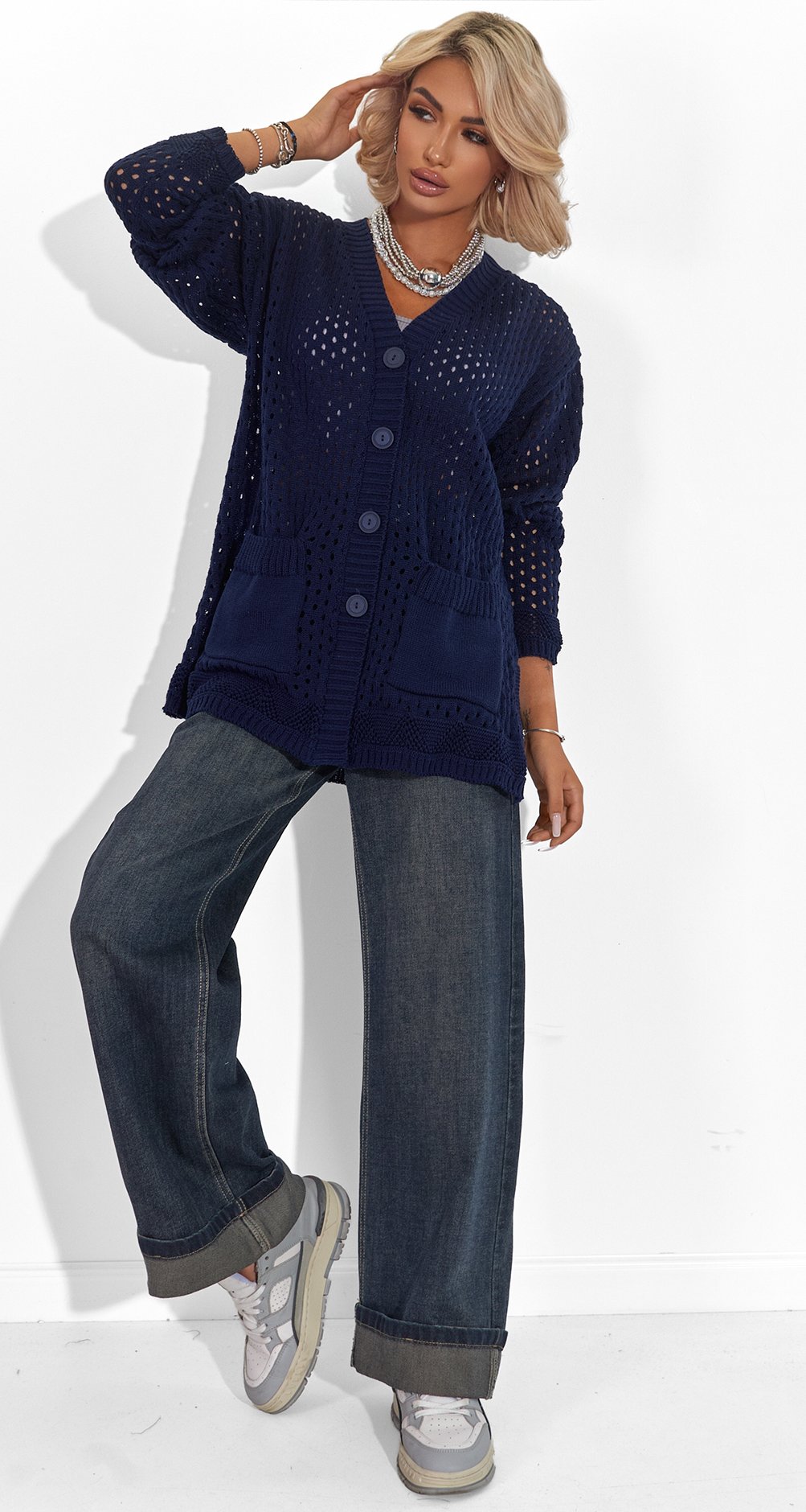 Теплий, але легкий, цей в'язаний кардиган оверсайз стане вашим улюбленим супутником у прохолодні літні вечори та затишні осінні дні. Практичні кишені додають функціональності та зручності.