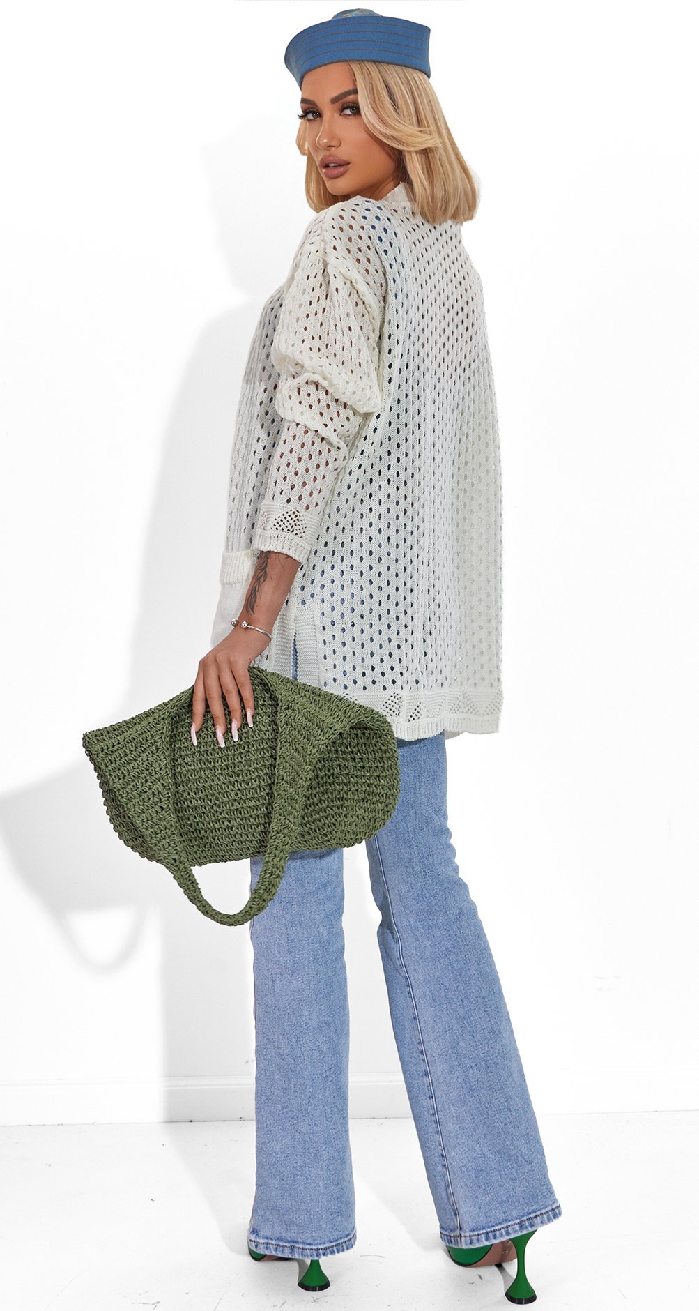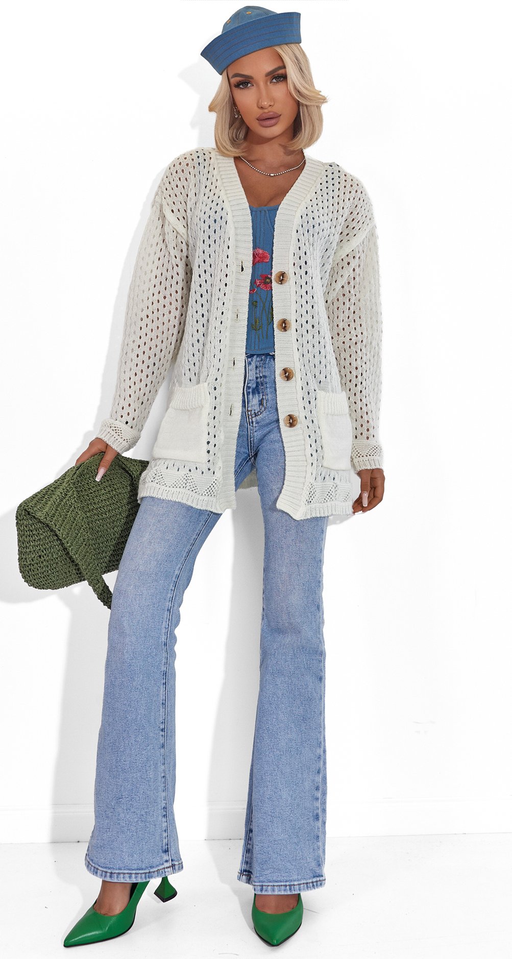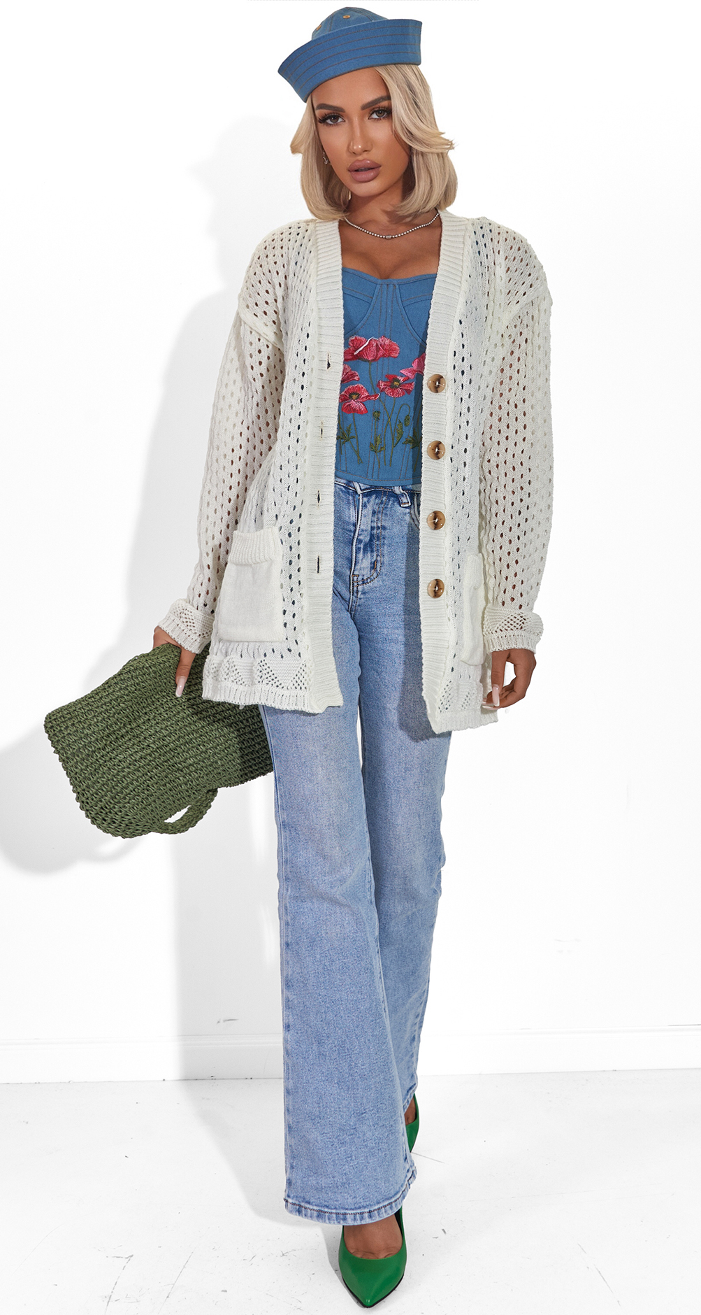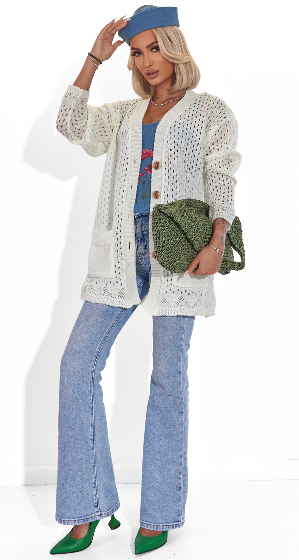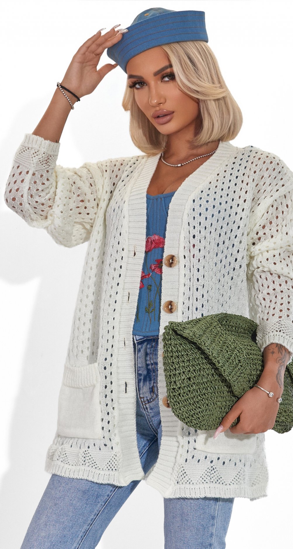 Теплий, але легкий, цей в'язаний кардиган оверсайз стане вашим улюбленим супутником у прохолодні літні вечори та затишні осінні дні. Практичні кишені додають функціональності та зручності.