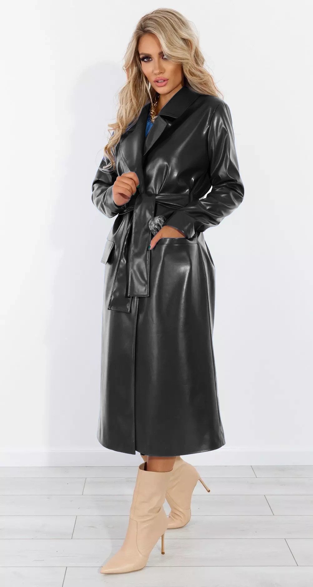 жіночна модель вільного крою із глибоким заходом і широким поясом, що перехоплюють талію, що й зав'язуються