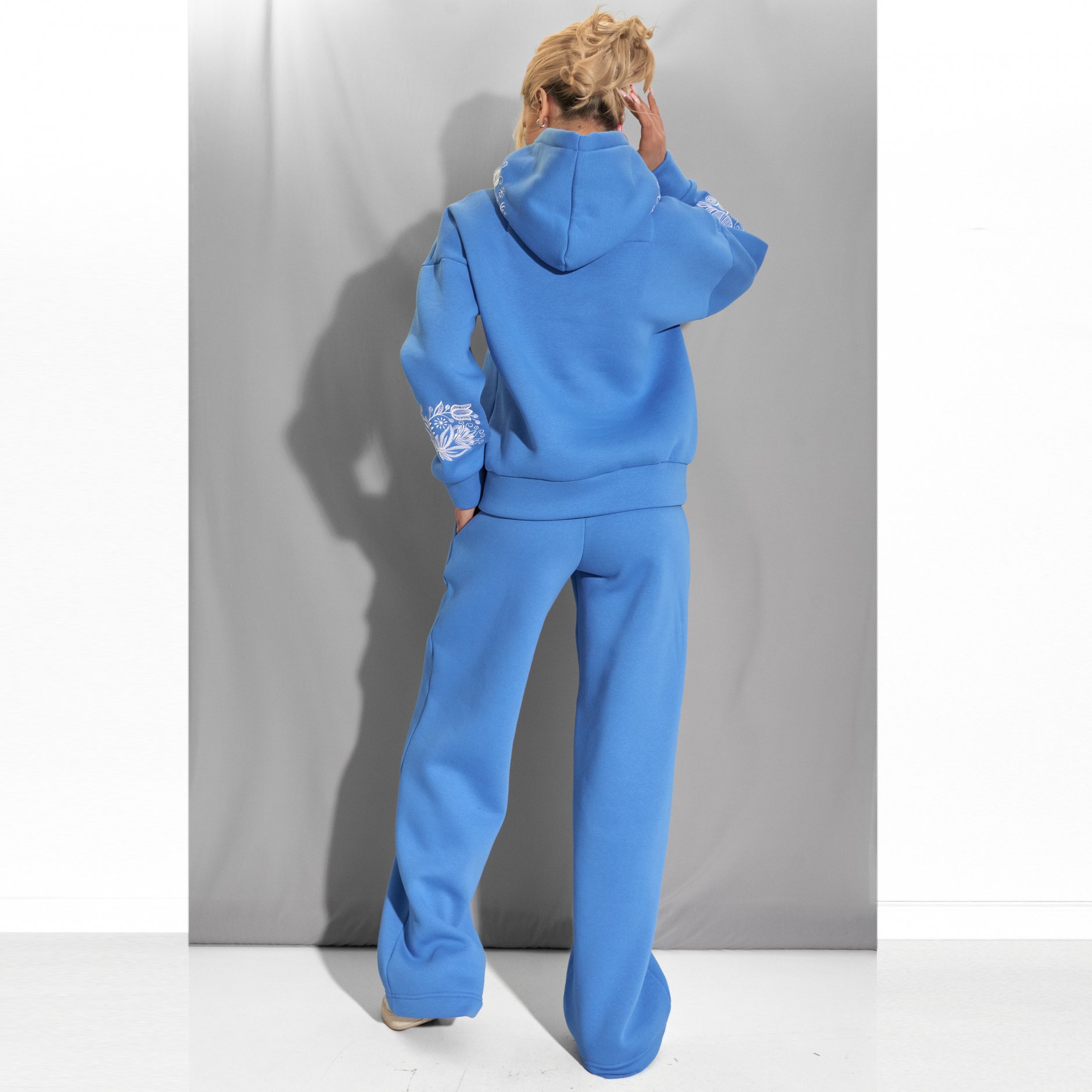 Вільний крій худорлявий з об'ємним капюшоном і широкі штани палаццо забезпечують повну свободу рухів, роблячи цей костюм незамінним для прогулянок, зустрічей з друзями або затишних вечорів будинку.