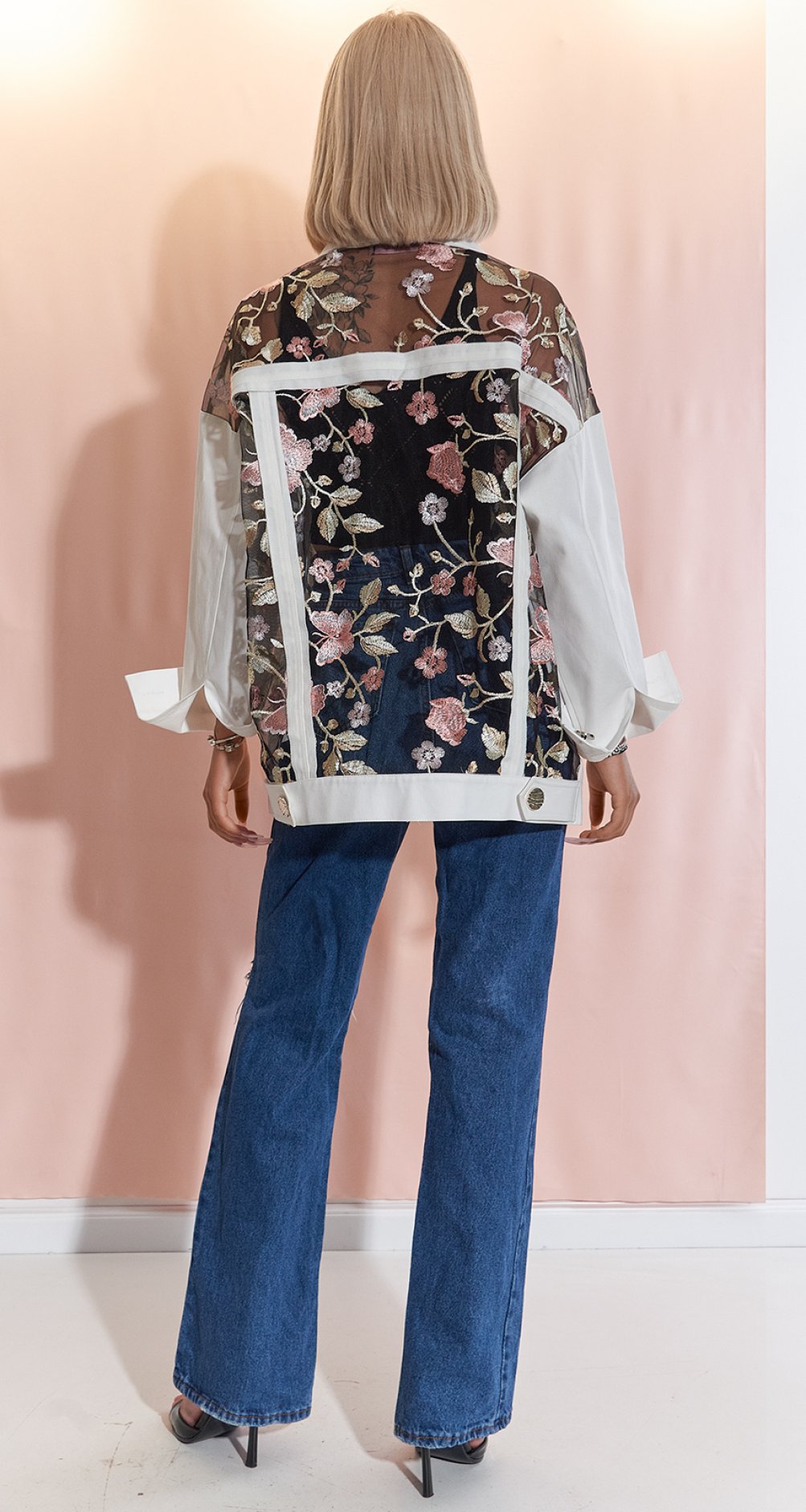 * Вишукана сітка з вишивкою: спинка прикрашена чудовою сіткою з квітковою вишивкою, що надає куртці неповторний шарм і жіночність.