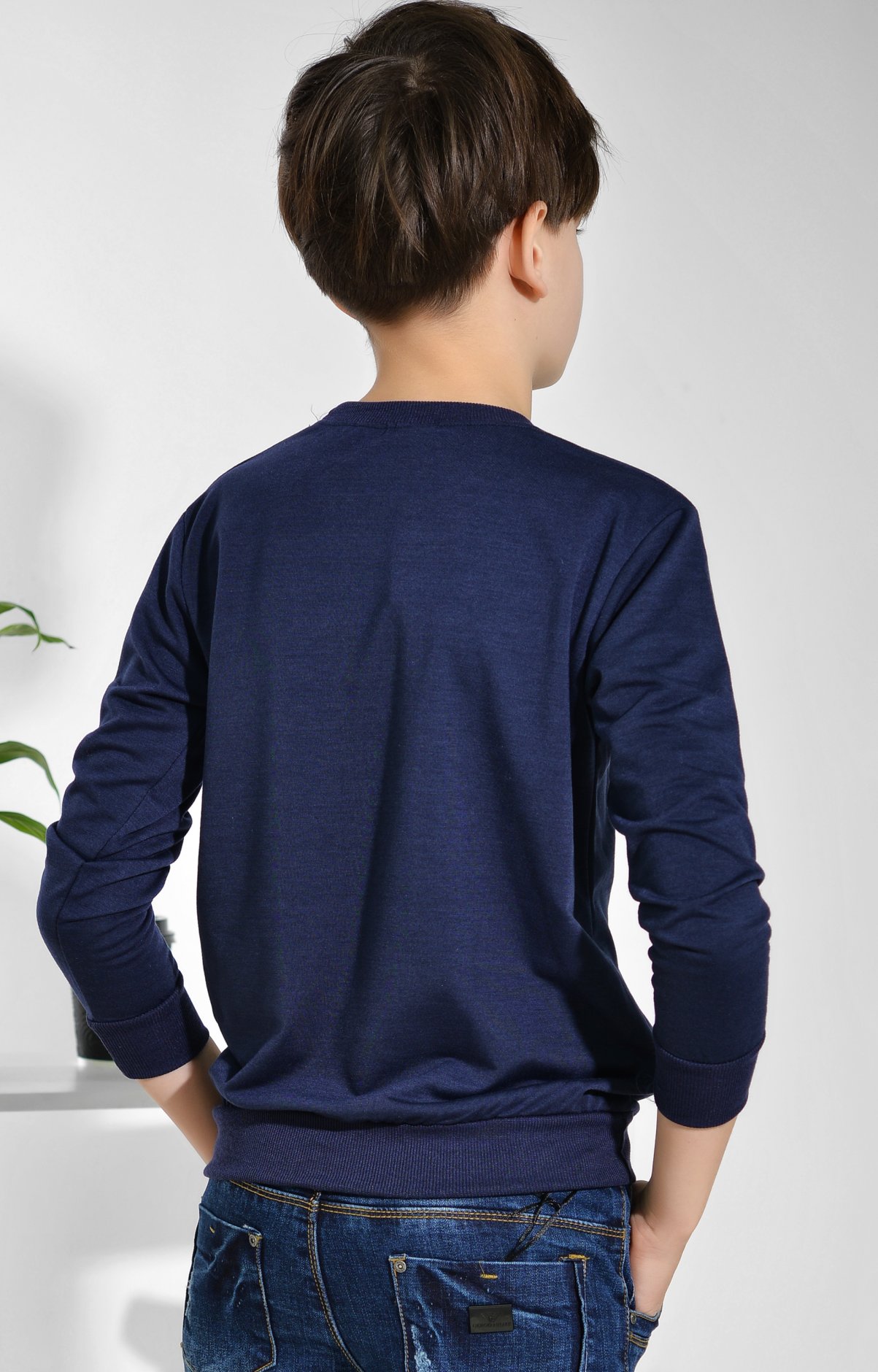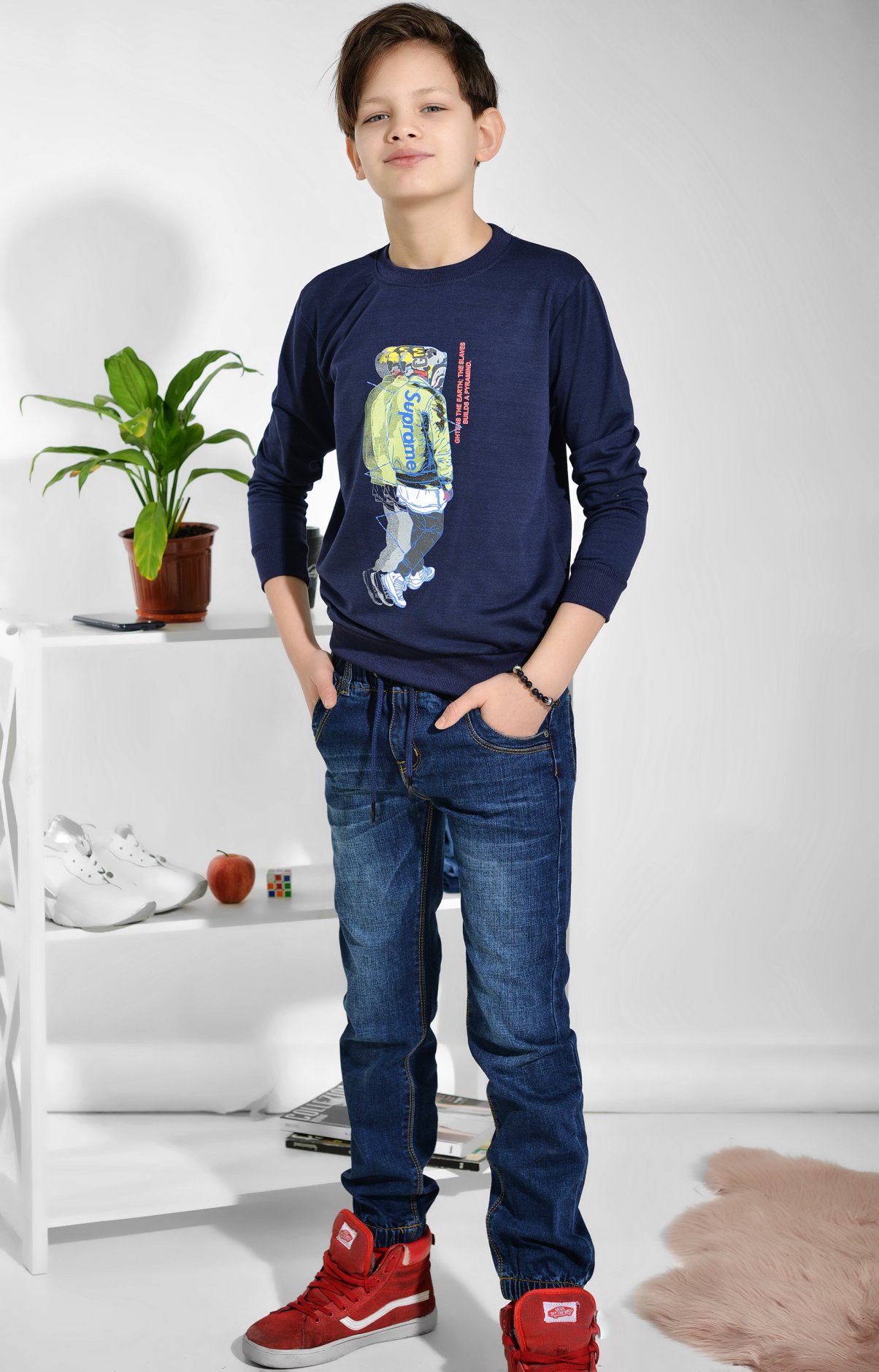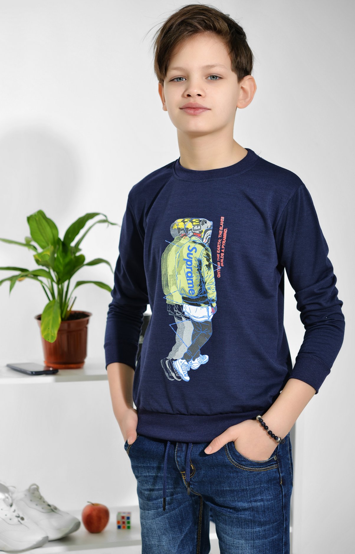 Трикотажний батник прикрашений принтом. Виконаний із комфортного матеріалу. Модель має напівприталений силует.