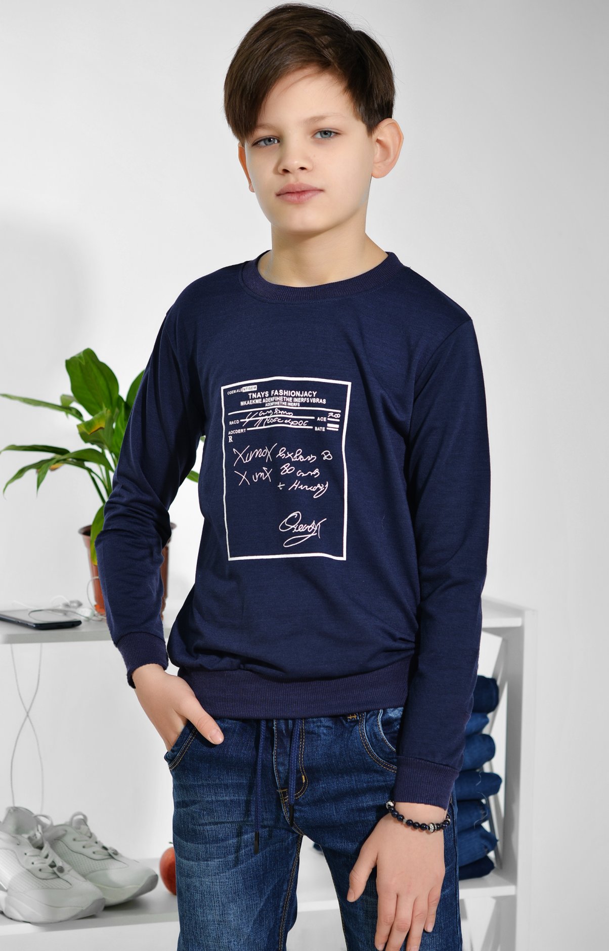 Трикотажний батник прикрашений принтом. Виконаний із комфортного матеріалу. Модель має напівприталений силует.