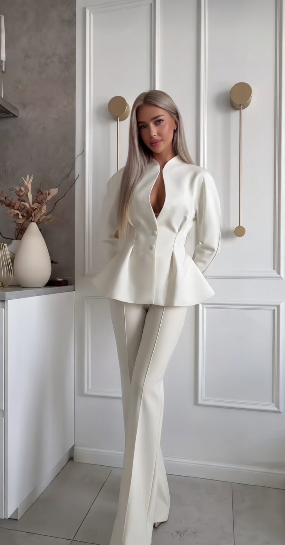 Цей білий костюм - втілення чистоти, архітектурного крою та впевненості. Він створений для тих, хто шукає сучасну альтернативу класиці та хоче виглядати бездоганно на будь-якому світському заході чи важливій зустрічі.