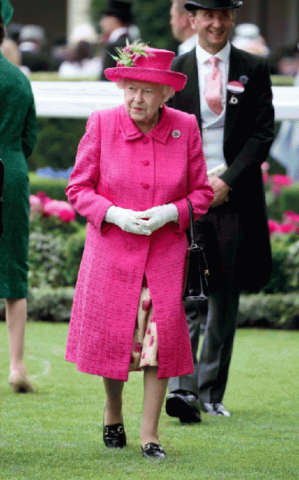 И в прошедшие выходные, для посещения Королевской Виндзорской выставки лошадей, Ее Величество предпочла ансамбль ярких оттенков. В угоду солнцу и яркому освещению, Королева остановилась на пальто с кантом цветочных мотивов и соответствующей стилю шляпой. И завершали ансамбль перчатки и туфли глубокого черного цвета, которые подчеркивали и обрамляли образ контрастным росчерком.