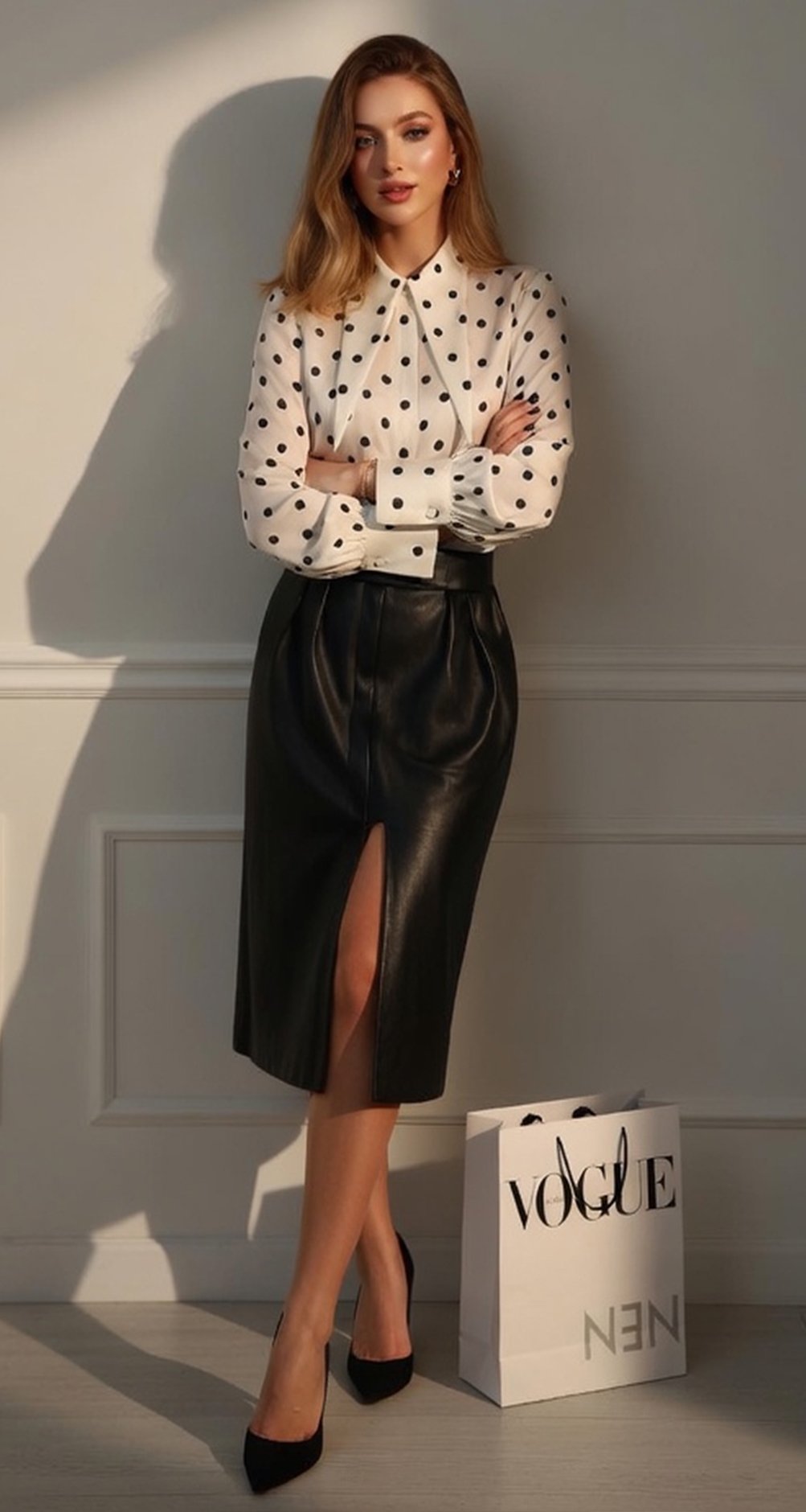 Ця блузка в горох – втілення ретро-шику у сучасній інтерпретації. Подовжений комір додає образу аристократичності, а бездоганний крій та якісна тканина роблять її незамінною інвестицією у базовий гардероб.
