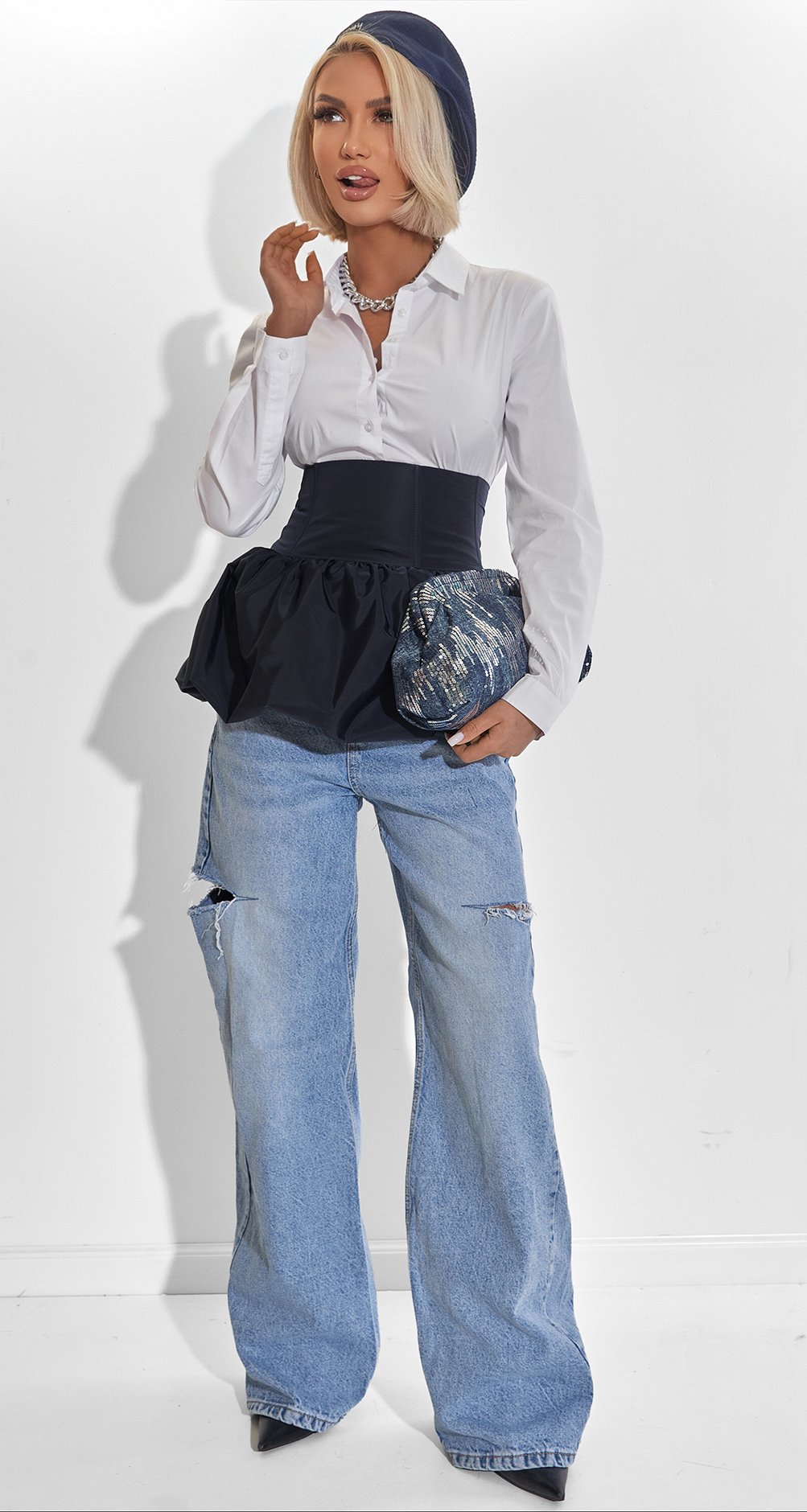 Гра фактур: Матовий щільний денім і глянсовий блиск паєток створюють неймовірно стильний контраст. Вона переливається під час кожного руху, притягуючи погляди.