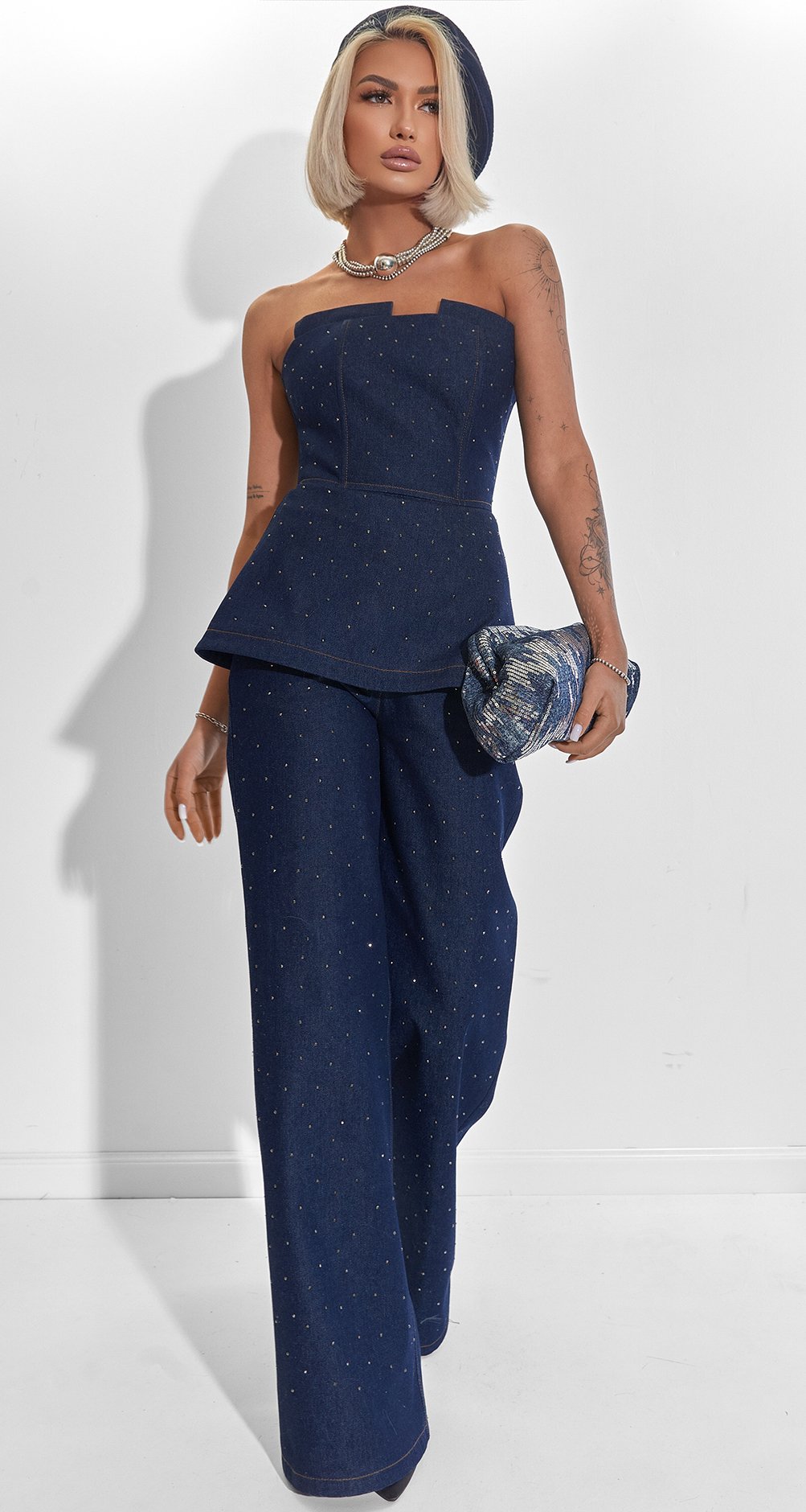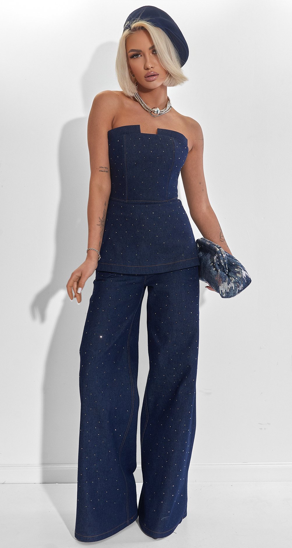 Цей корсет – справжній діамант нашої колекції. Він поєднує грубу фактуру деніму з ювелірним сяйвом, створюючи образ, який неможливо забути. Це ідеальна броня для сучасної амазонки, що вибирає розкіш та впевненість.