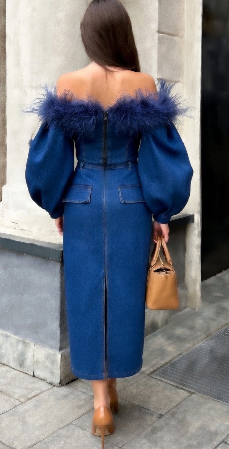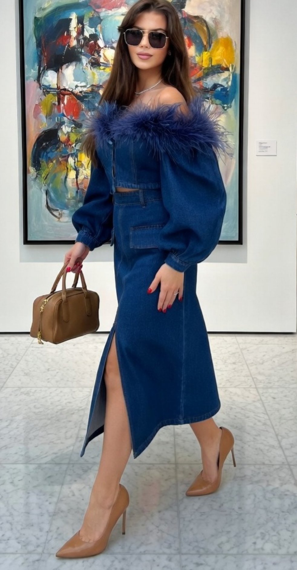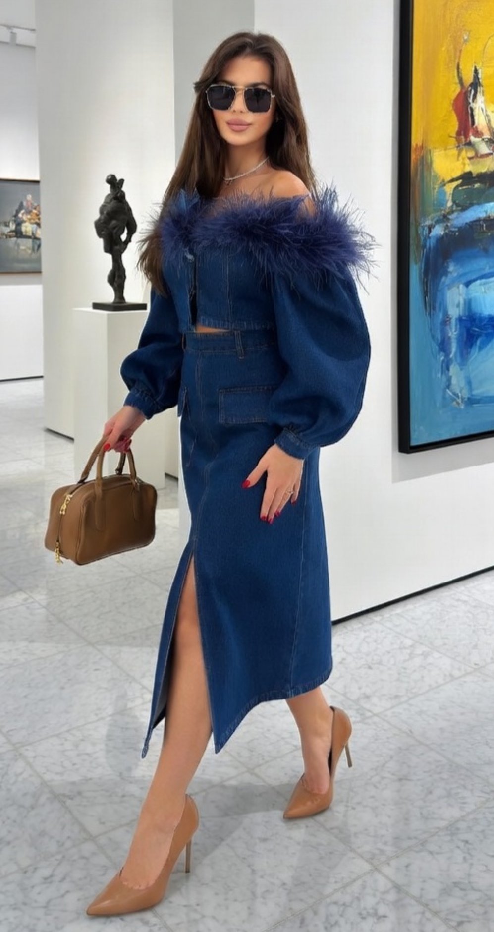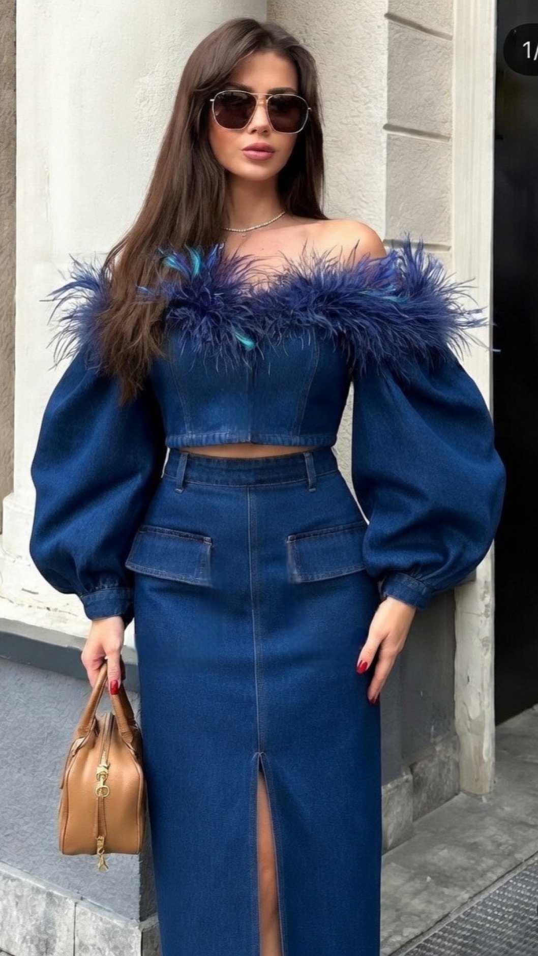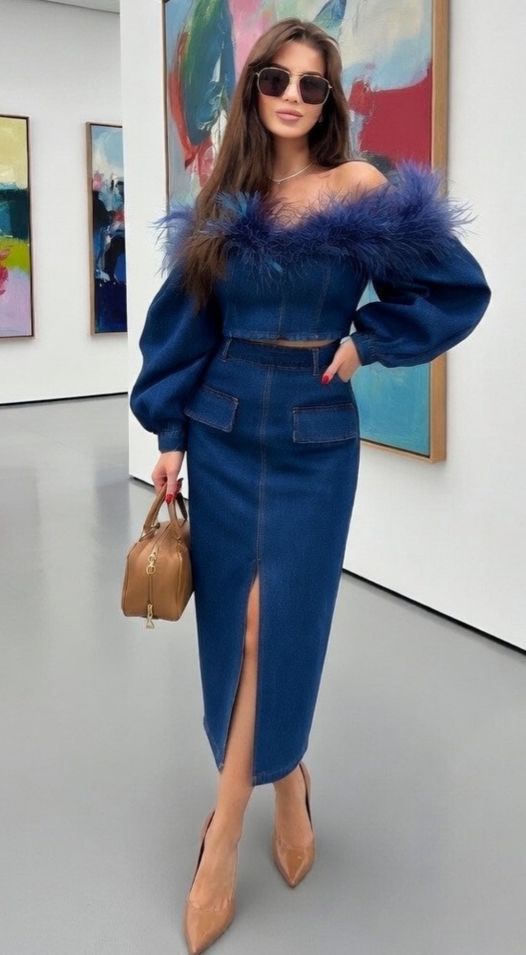 Цей джинсовий комплект - справжній виклик буденності. Ми поєднали грубу естетику деніму з крихкістю натурального пір'я, щоб створити образ, який неможливо забути.