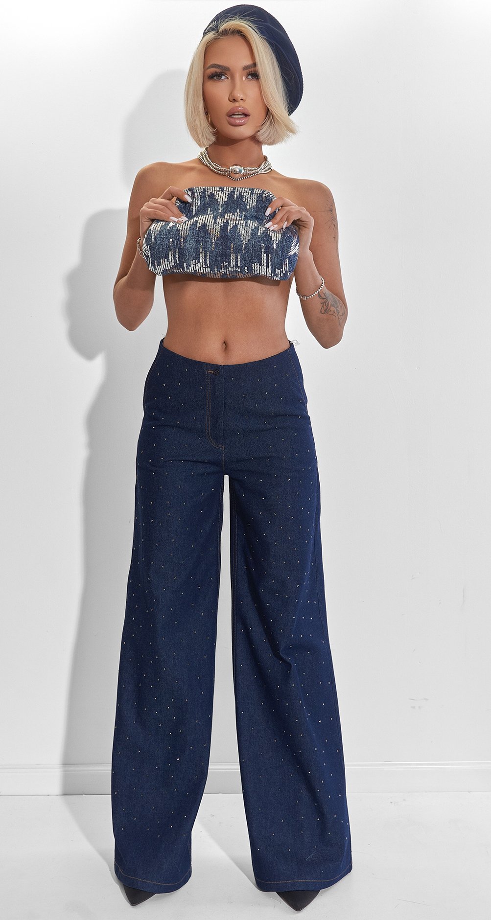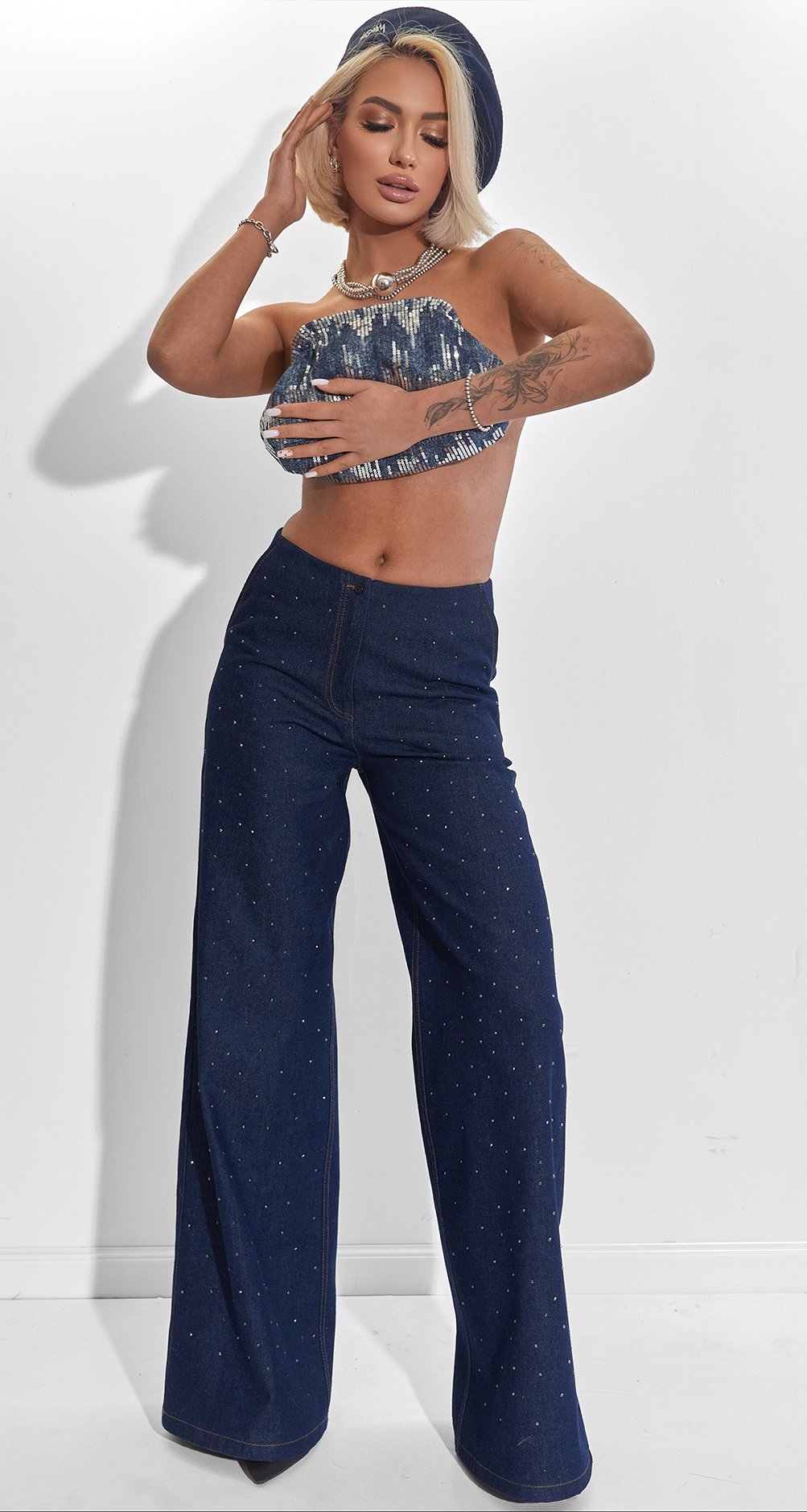 Брюки-кльош: Наймодніший силует сезону! Клеш візуально подовжує ноги, а розсип кристалів спереду робить кожен ваш крок по-справжньому блискучим.