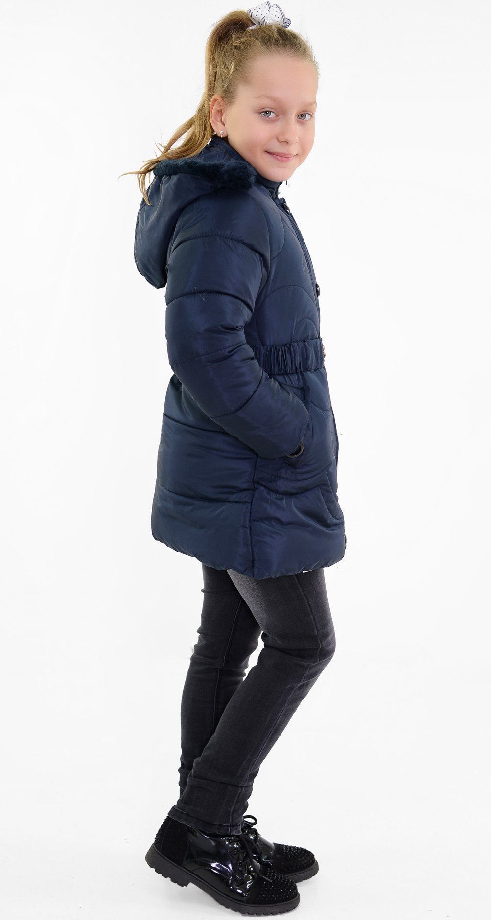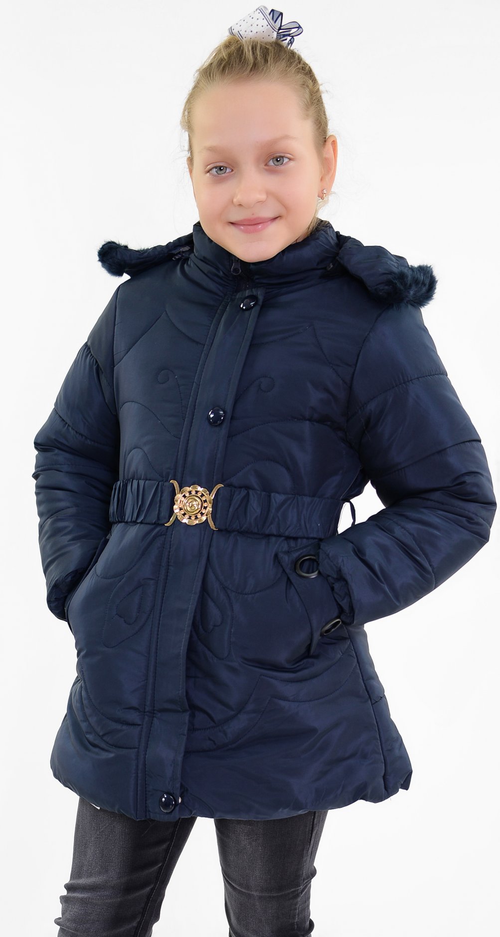 Warm jacket for girls with a hood. The jacket is elongated, insulation - hallofiber. The jacket also has convenient pockets.