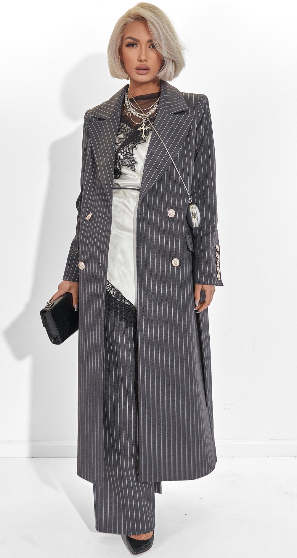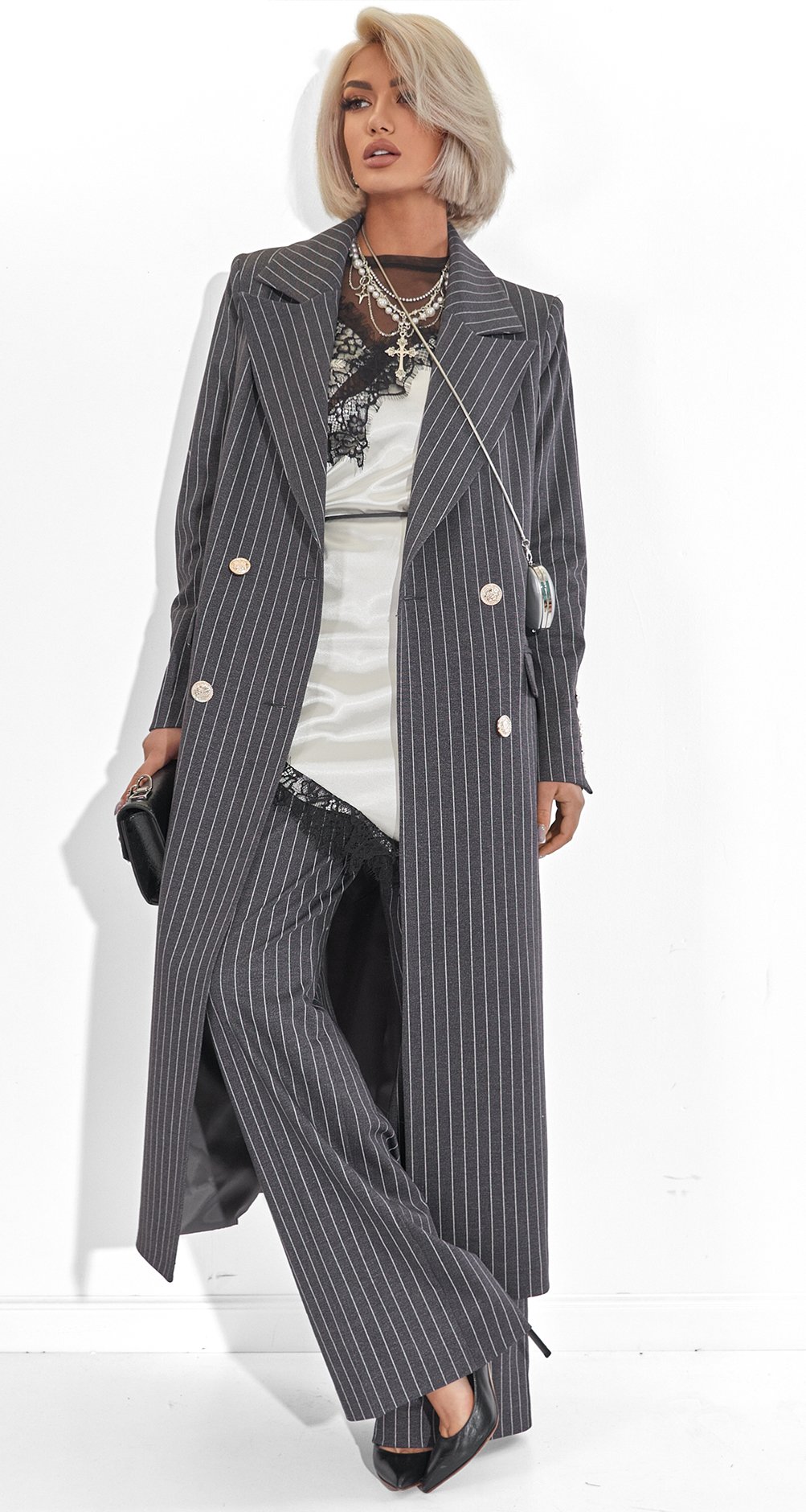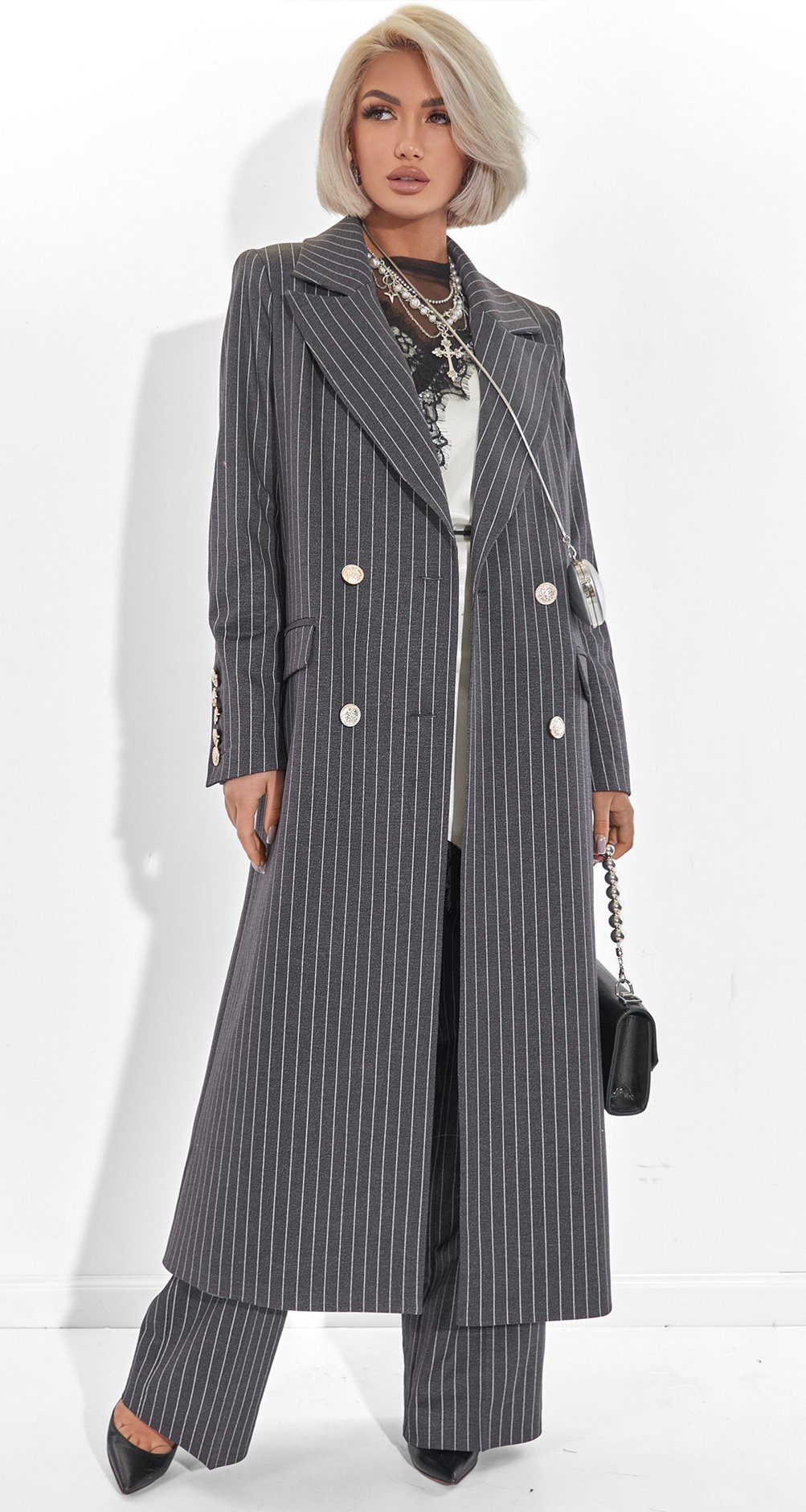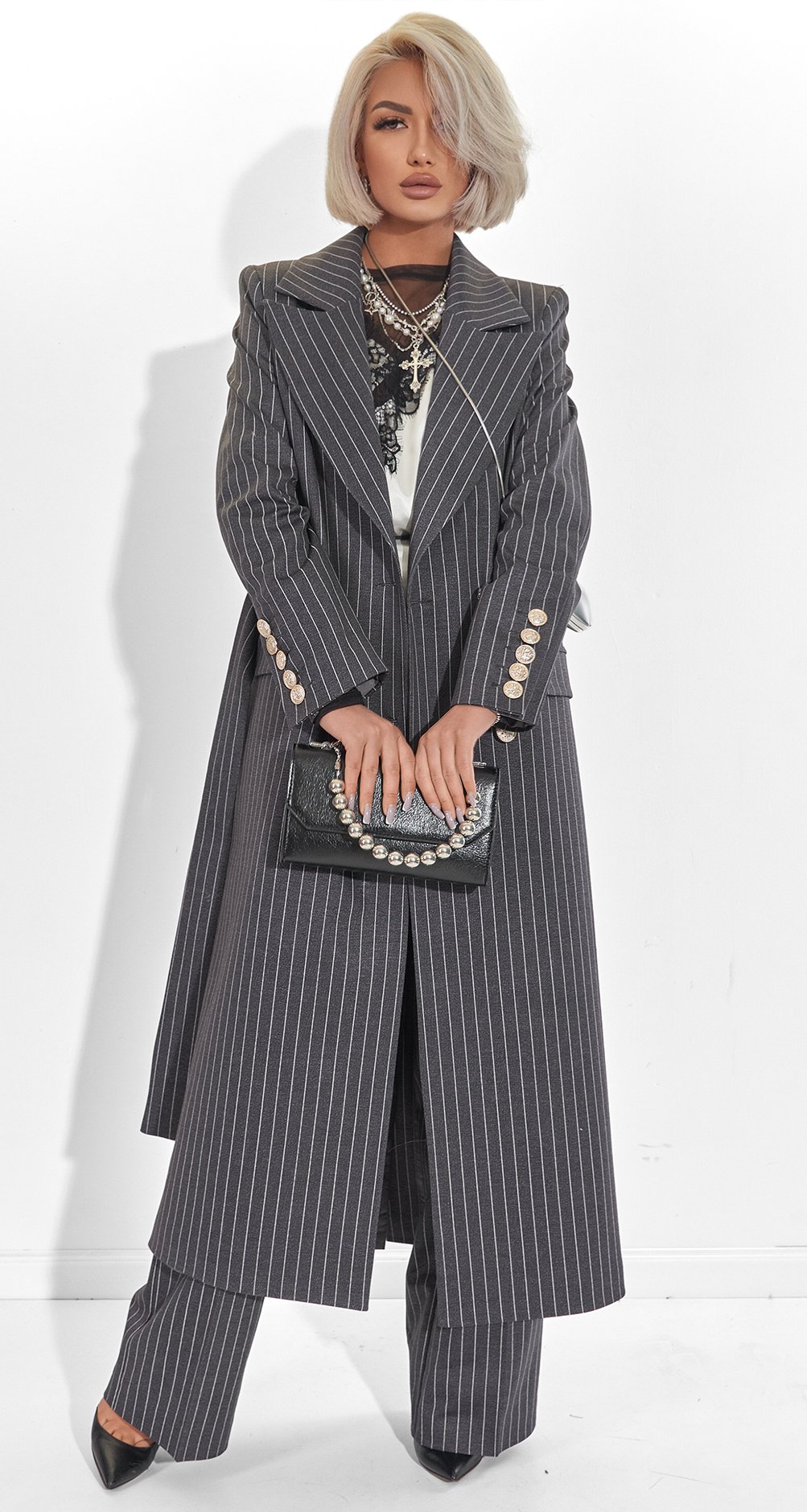 This suit is the epitome of power dressing. The pinstripe paired with a dense fabric creates the image of a confident woman who appreciates classics yet remains on trend. It's an investment in status and an impeccable silhouette.