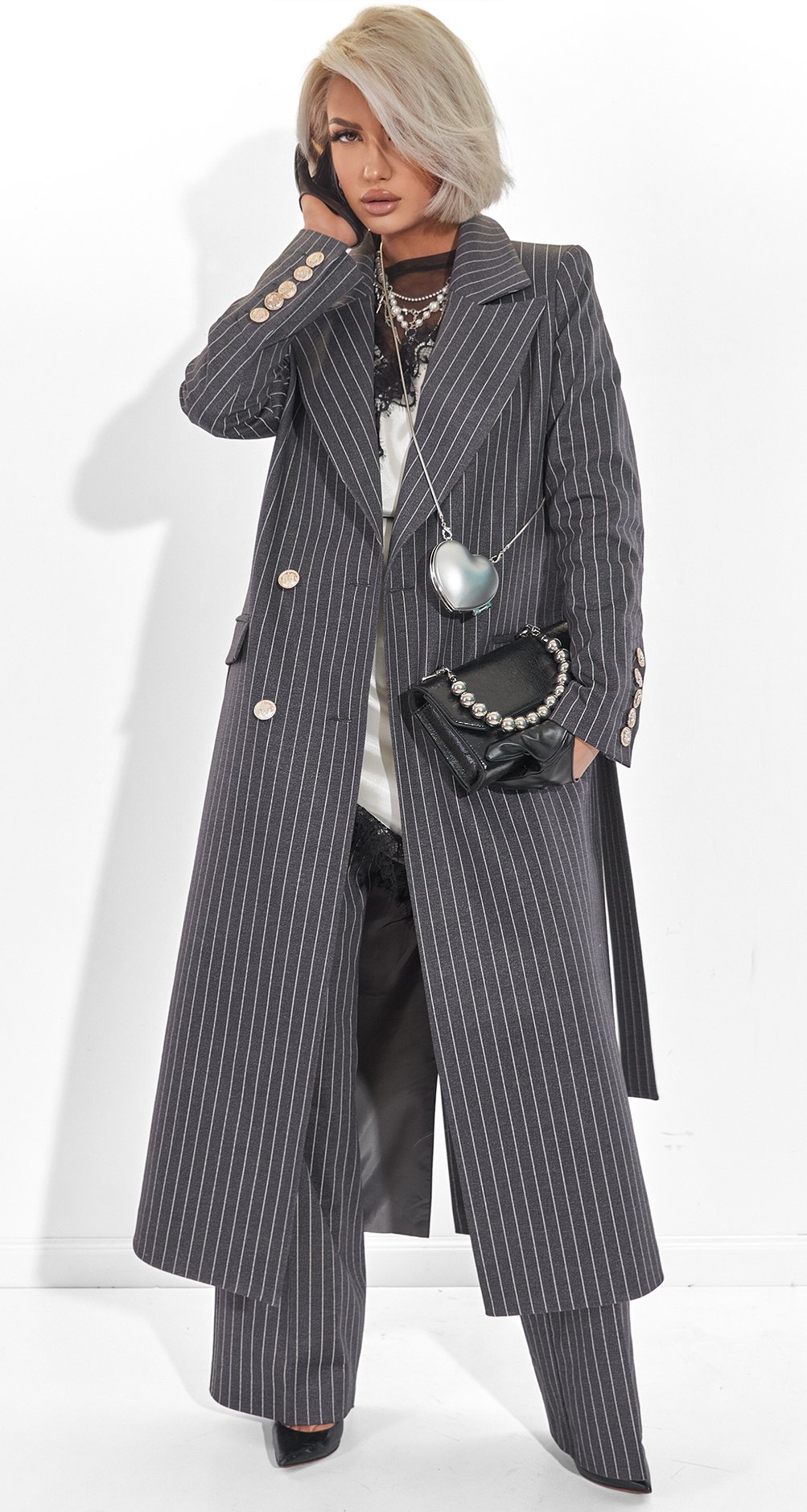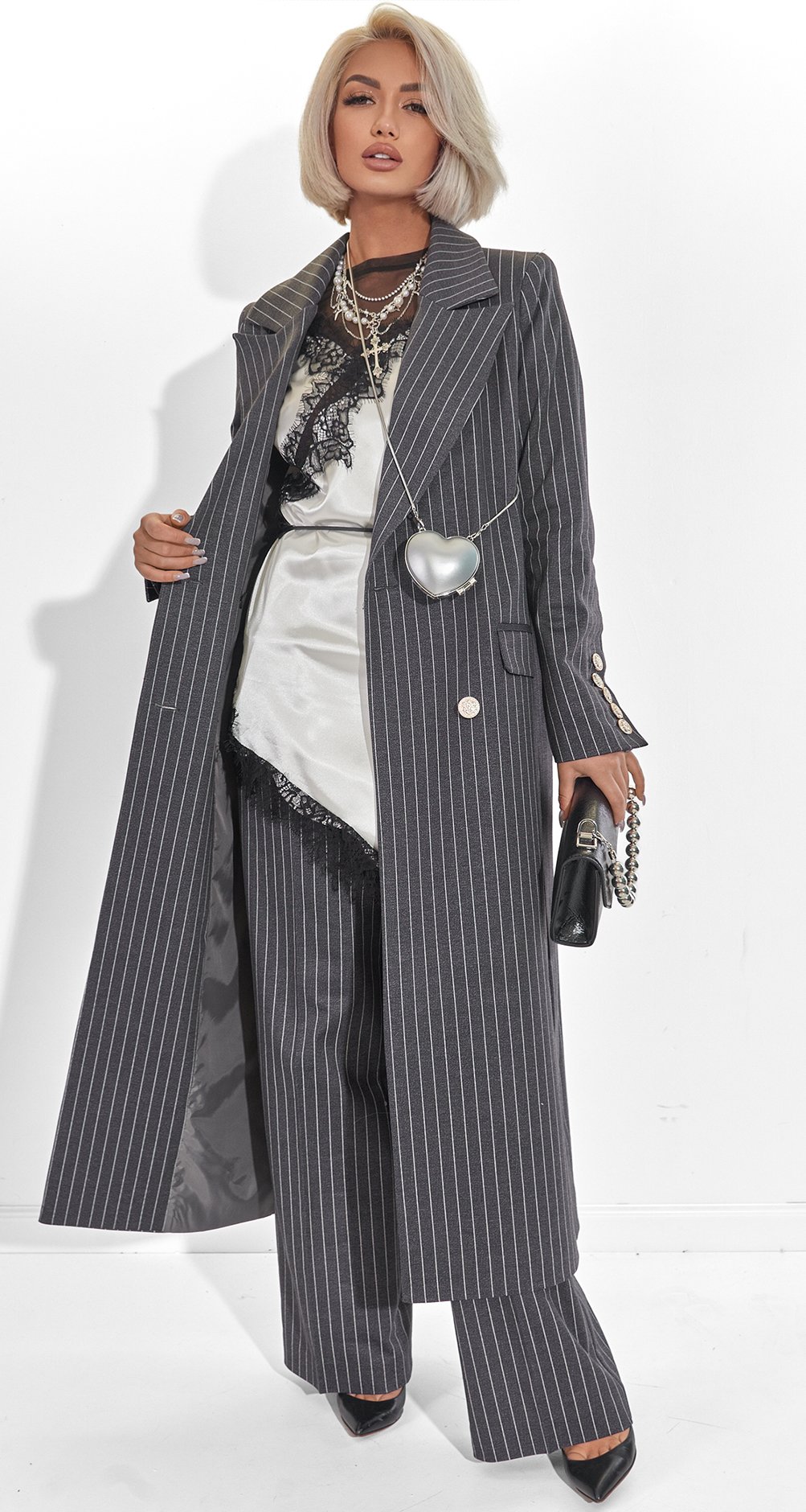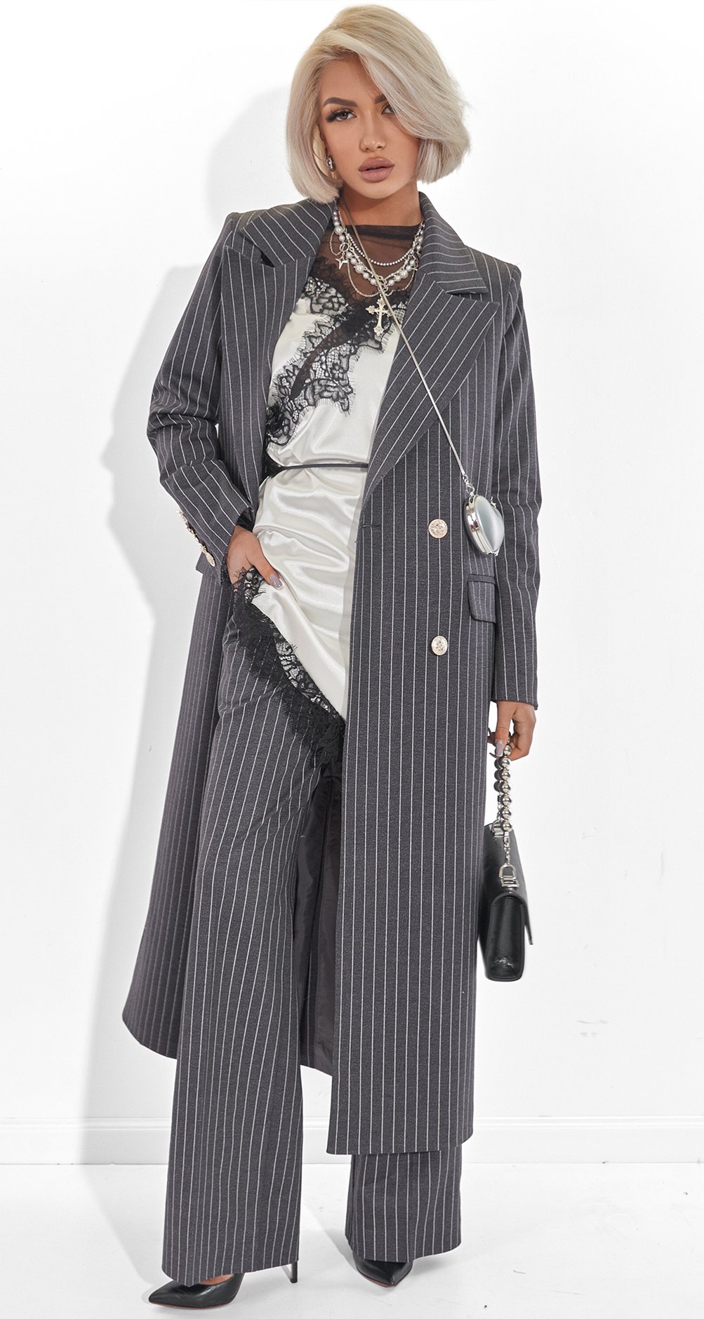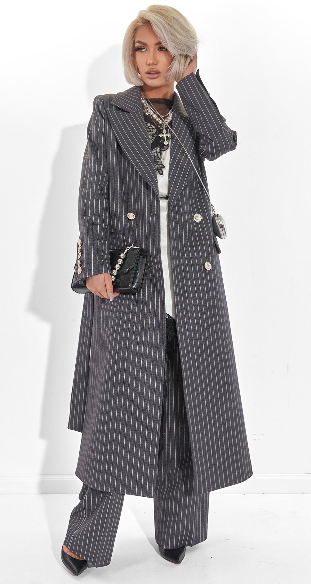 This suit is the epitome of power dressing. The pinstripe paired with a dense fabric creates the image of a confident woman who appreciates classics yet remains on trend. It's an investment in status and an impeccable silhouette.