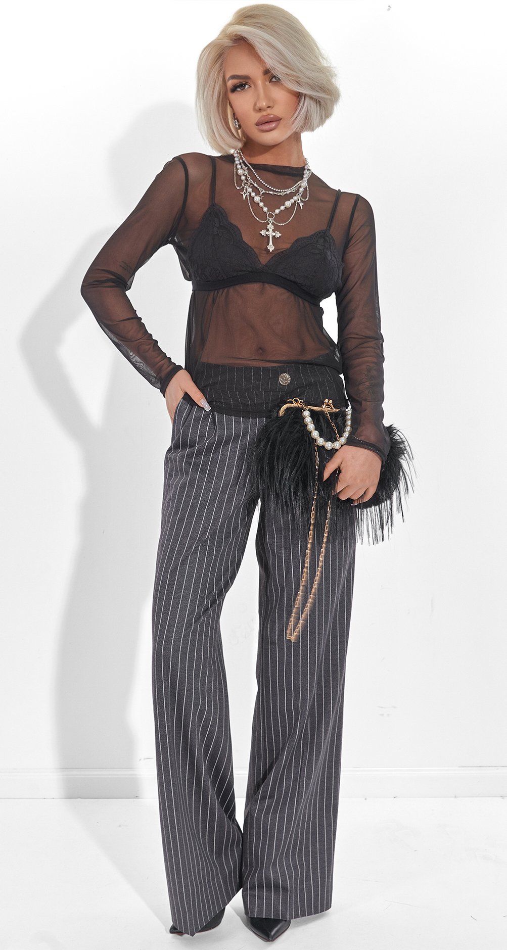 Classic trousers: Perfectly defined lines visually elongate the silhouette and lengthen the legs. Convenient pockets make them practical, and the high-quality fabric doesn't stretch at the knees, maintaining a crisp creased silhouette.