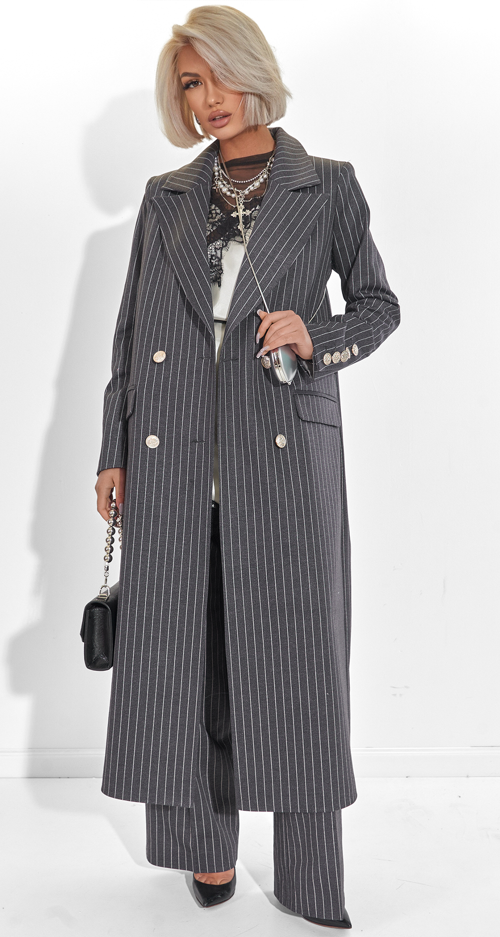 ​Jacket-coat: The elongated cut and dense texture make it suitable for wearing as a standalone outer layer in cool weather. Fully lined, it ensures a perfect fit across the shoulders and a smooth glide over any long-sleeved shirt or blouse.