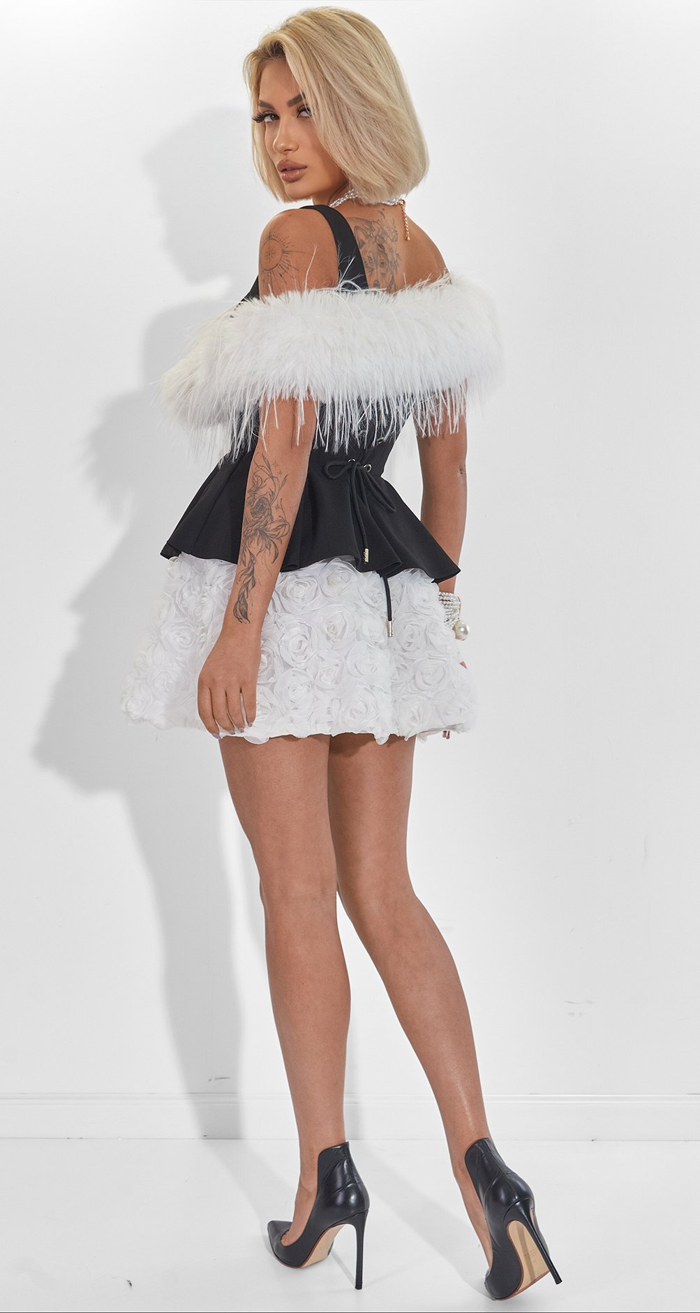 Dream skirt: Made of unique fabric with voluminous 3D roses. It is light, airy and incredibly textured. Every step you take will be accompanied by the play of the world in petals.