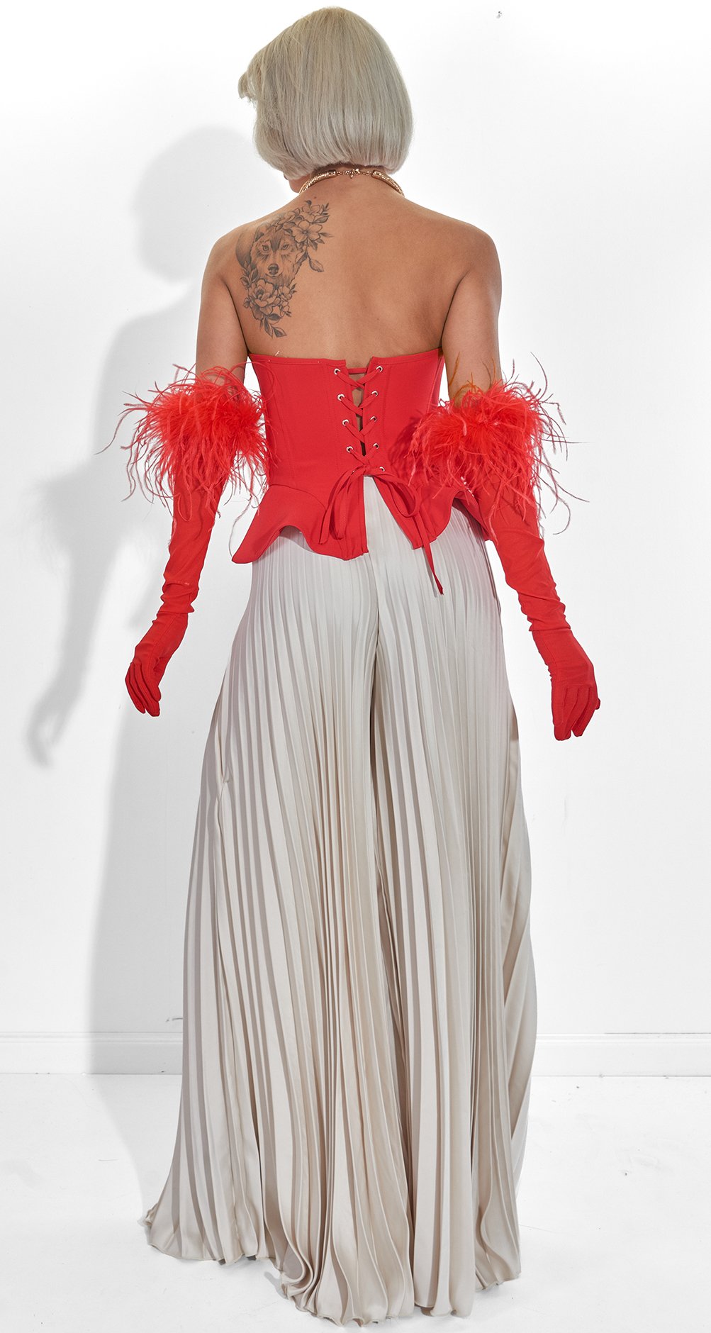 This set is the embodiment of modern luxury and femininity. The combination of a structural corset that holds the shape and flowing pleats creates the same "expensive" silhouette that looks appropriate both on the red carpet and at dinner in a restaurant.