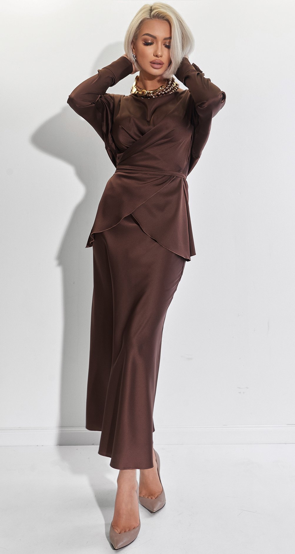 We chose dense eco-silk, which has a pleasant heaviness and effectively flows over the figure, hiding everything else and emphasizing only your fragility.