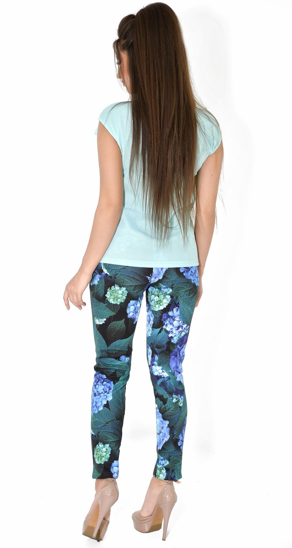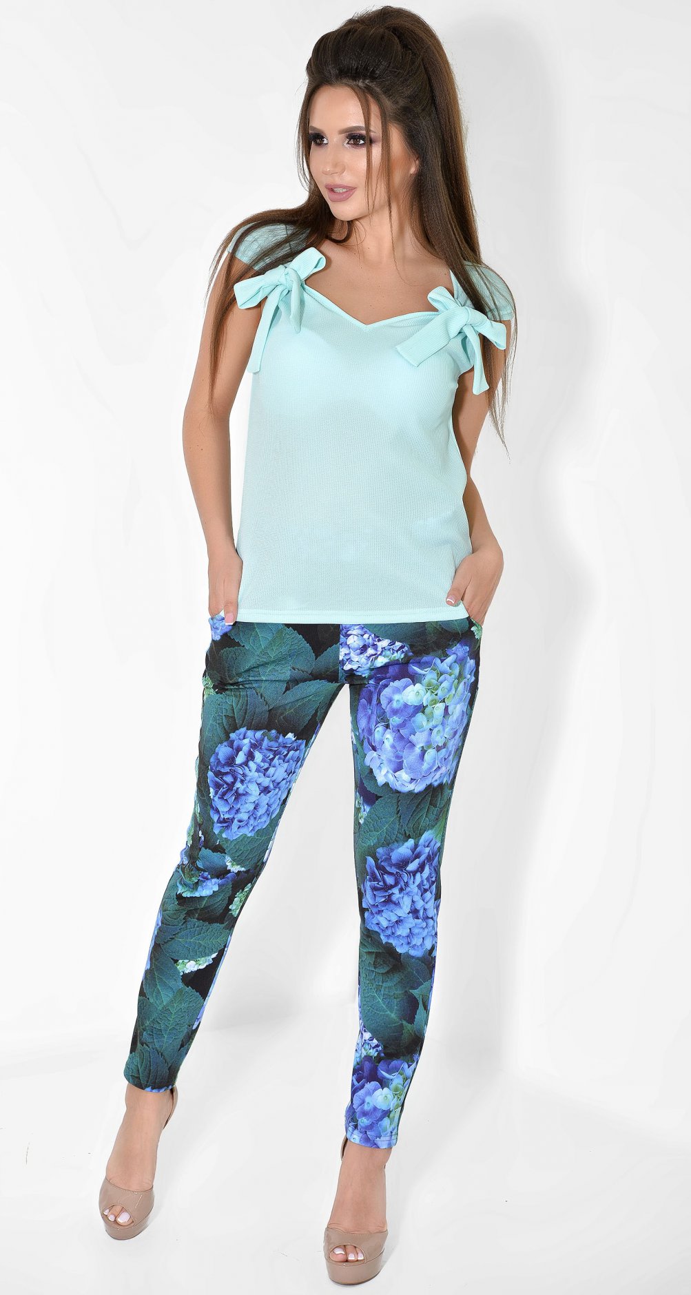 The set consists of a blouse with bows and tapered trousers with a floral print.