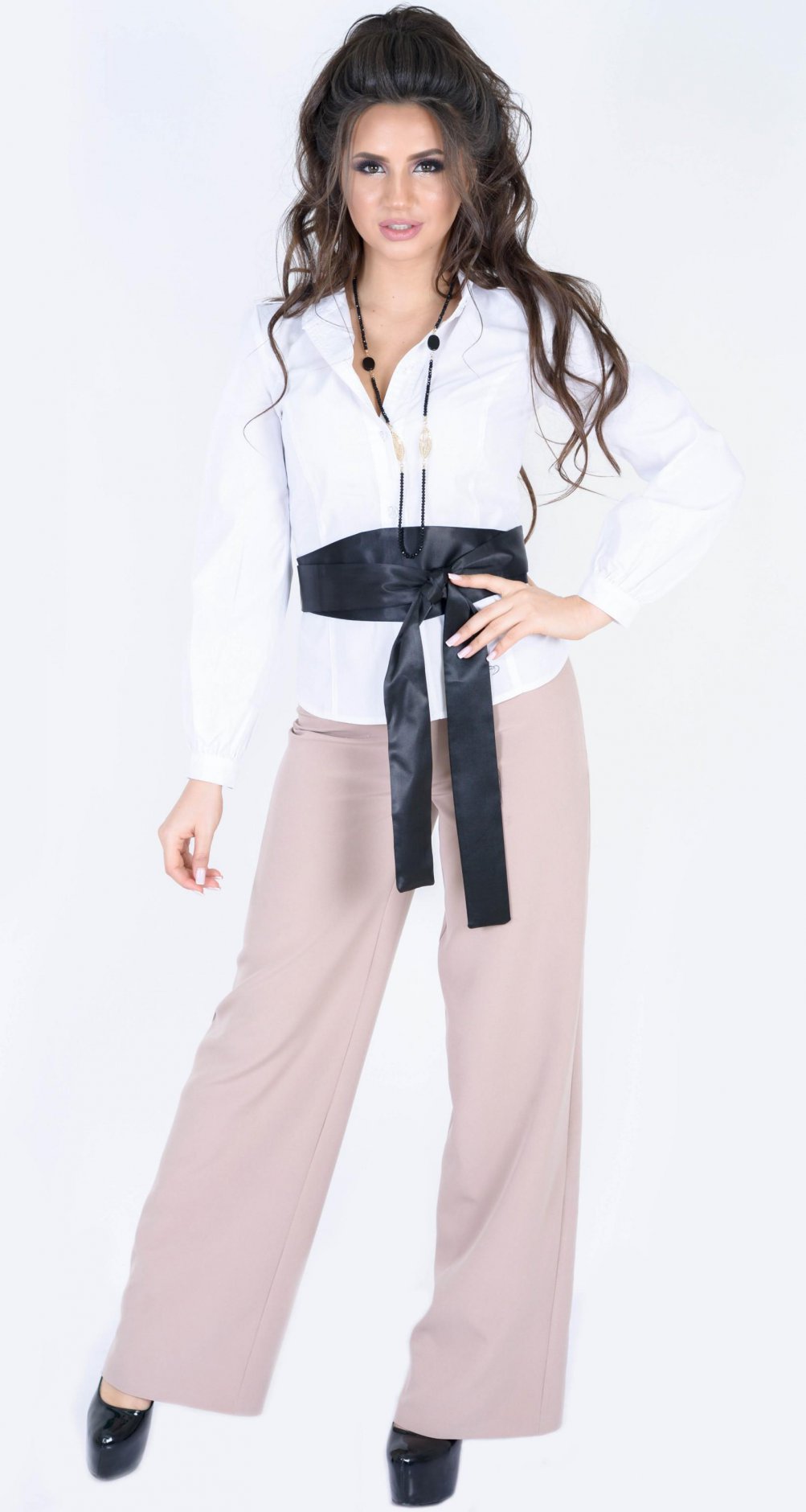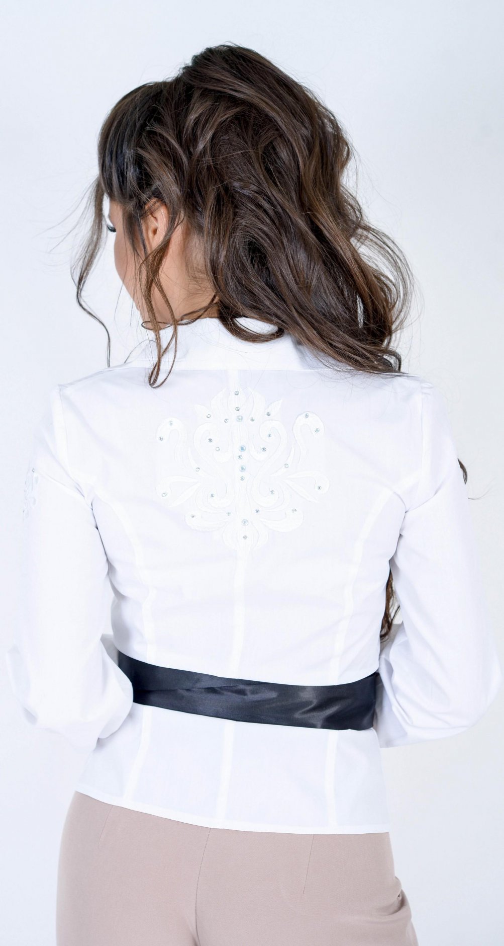 The shirt with a pattern and rhinestones is complemented by a wide satin belt.