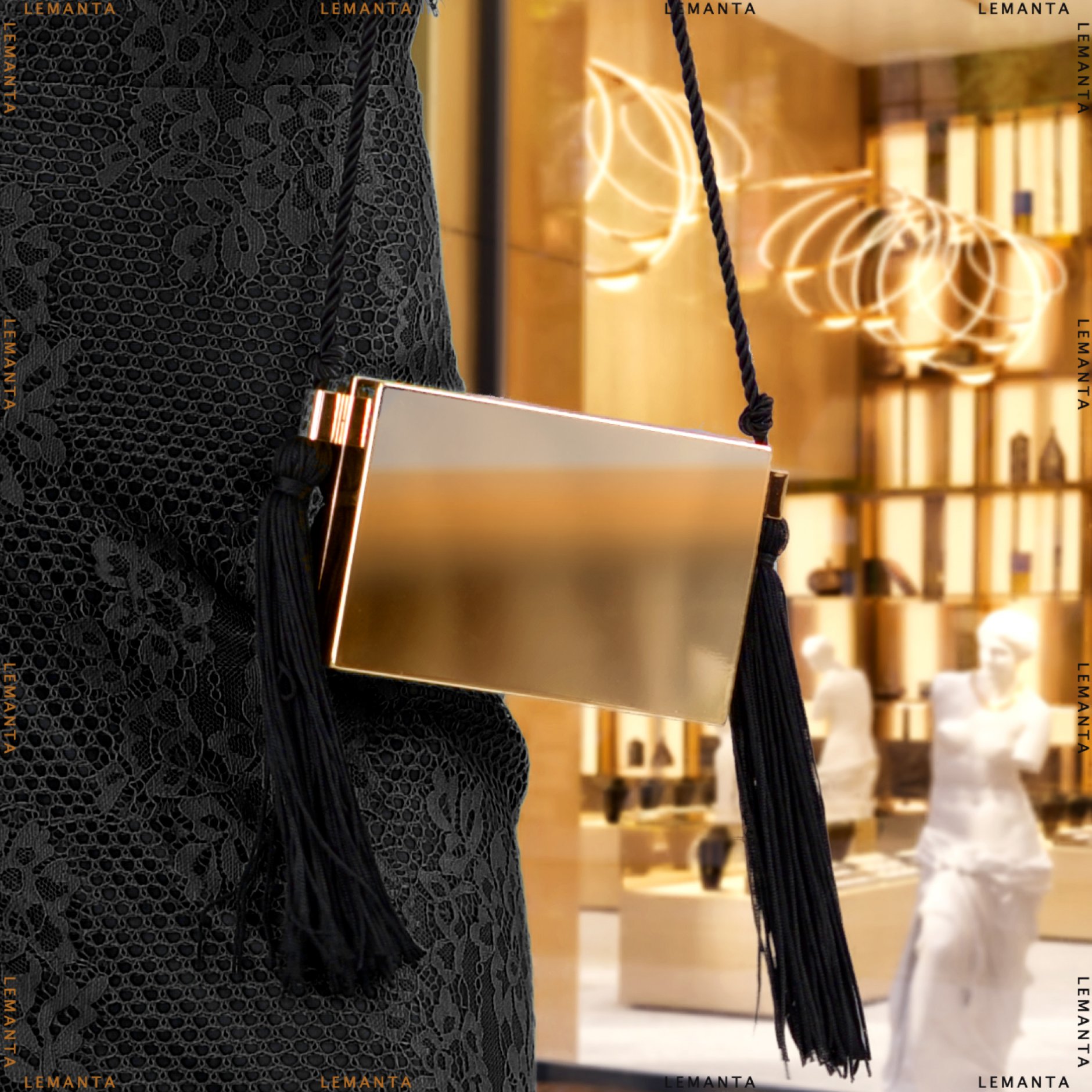 Evening hard mini bag. Mirror gold color with black tassels and strap.
