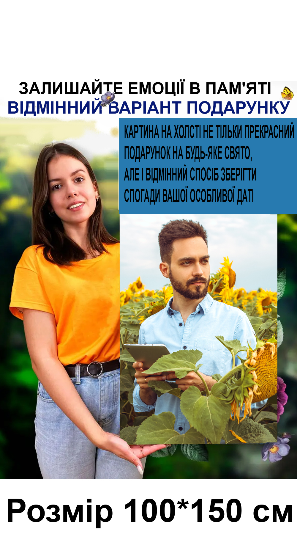 Якщо ви шукаєте оригінальний подарунок на річницю весілля, день народження, ювілей чи Новий рік, то картина по фото – це саме те, що вам потрібне. Ви можете надрукувати на полотні будь-яке фото або портрет, який виглядатиме стильно та ефектно на стіні будь-якої кімнати в будинку. Картини на полотні – це друк фотографій на великому полотні за допомогою спеціальної технології. Ви можете замовити фото на полотні для своїх батьків, друзів, хлопця чи подруги. Вони будуть чудово виглядати у вітальні, спальні, дитячій, кухні або будь-якому іншому приміщенні. Фото на полотні – це не просто альбом для фото, це настінне мистецтво, яке підійде для будь-якого інтер'єру. Ви можете вибрати вертикальну або горизонтальну орієнтацію картини та відповідну рамку до неї, а кріплення для вішання на стіну йде в комплекті. Наша компанія пропонує красиві та стильні інтер'єрні картини на полотні для всіх випадків життя. Наші художники можуть створити вам оригінальний малюнок або підібрати фон для вашої картини. Ви також можете замовити картини на полотні в подарунковій упаковці, щоб подарувати їх своїм близьким та друзям, мамі чи татові. Ми використовуємо натуральні матеріали картини, а саме полотно щільністю 260 гр, сосновий підрамник та друк на японському устаткуванні. Для того, щоб замовити картину, необхідно надіслати вибране вами фото або будь-яке інше зображення згідно з інструкцією. Не пропустіть можливість зробити подарунок батькам на ювілей, Новий рік чи будь-яку іншу урочистість. Замовте друк фото на полотні зараз!