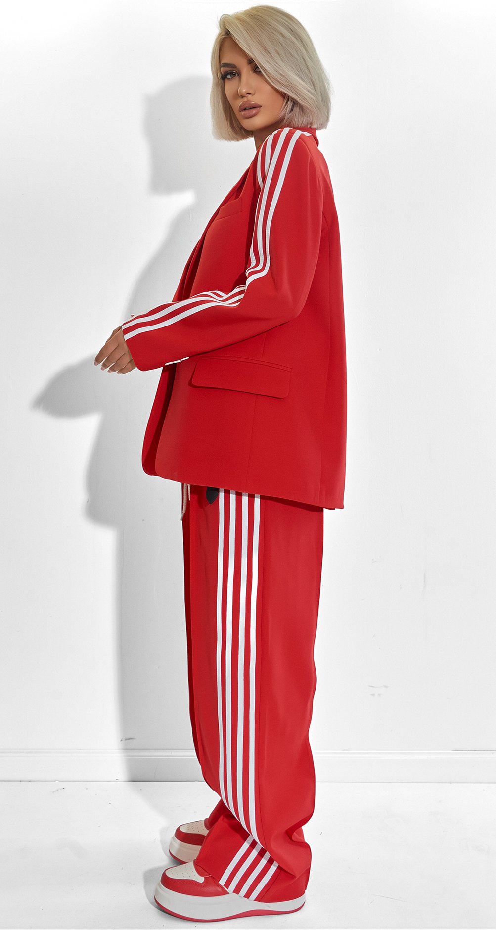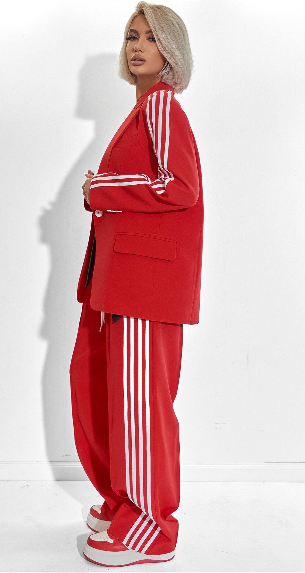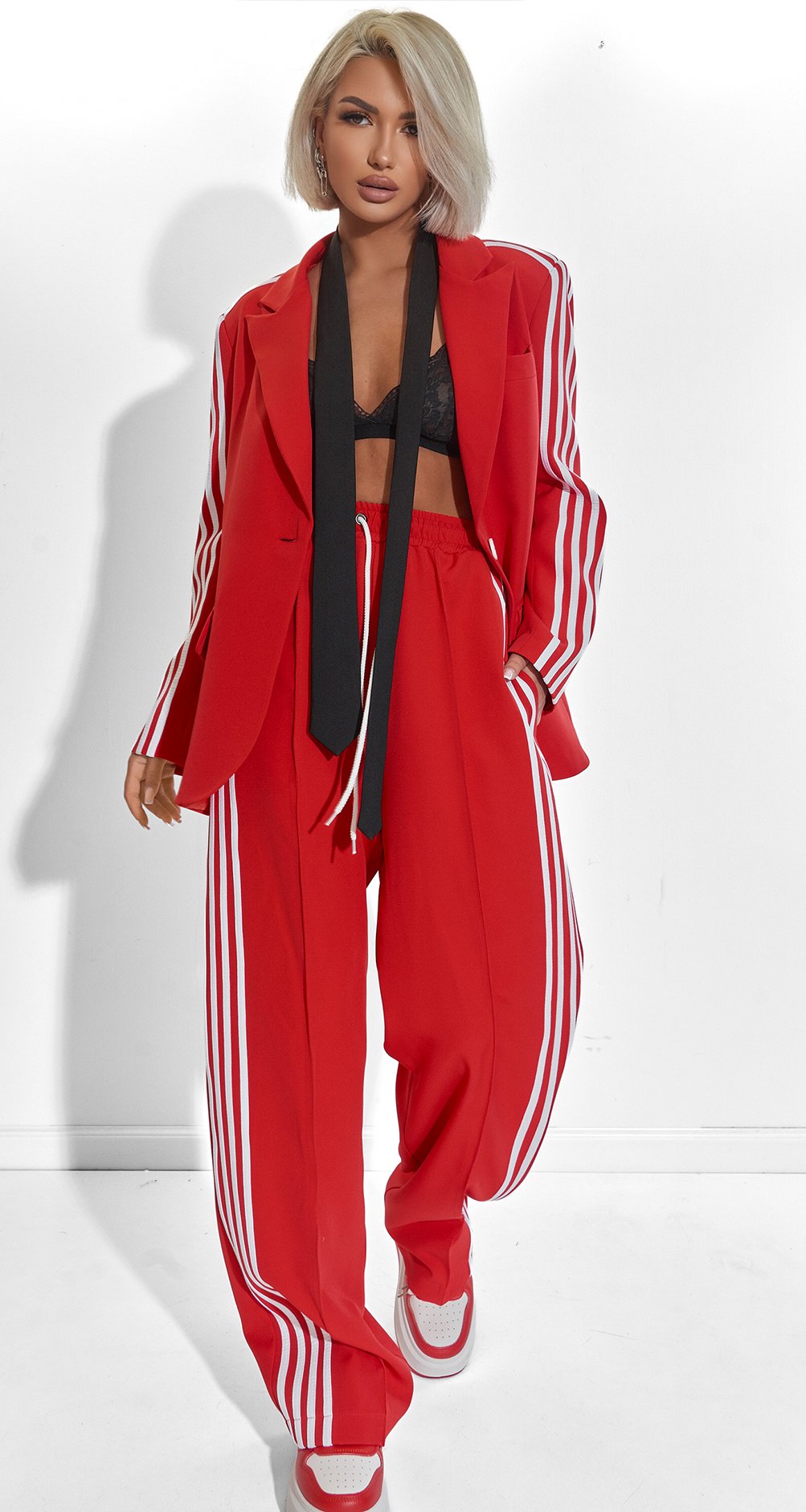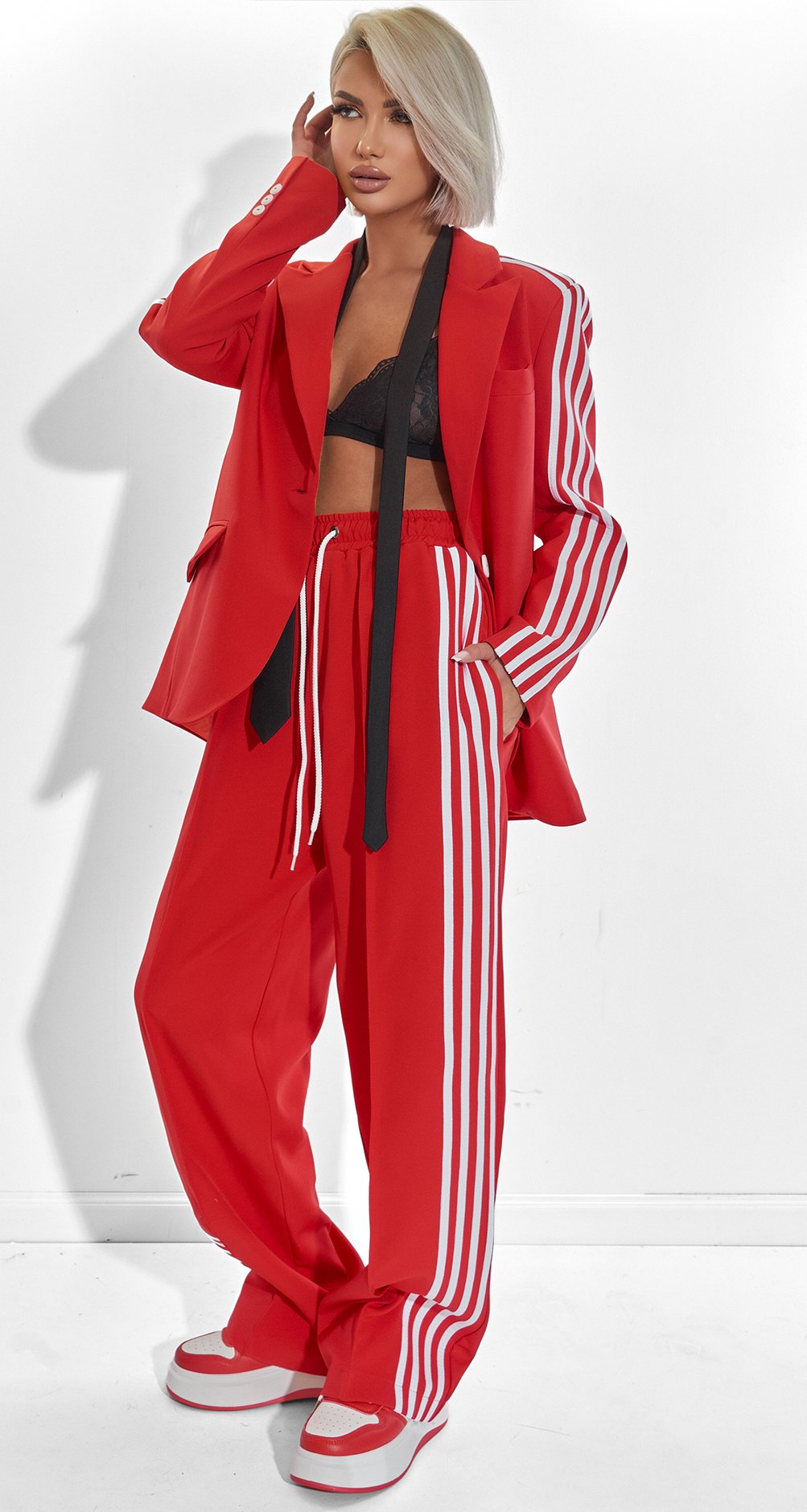 ‚Забудьте про звичайний трикотаж. Тут головну роль відіграє преміальна костюмна тканина, яка тримає ідеальну форму, та контрастні лампаси, що надають образу драйву.