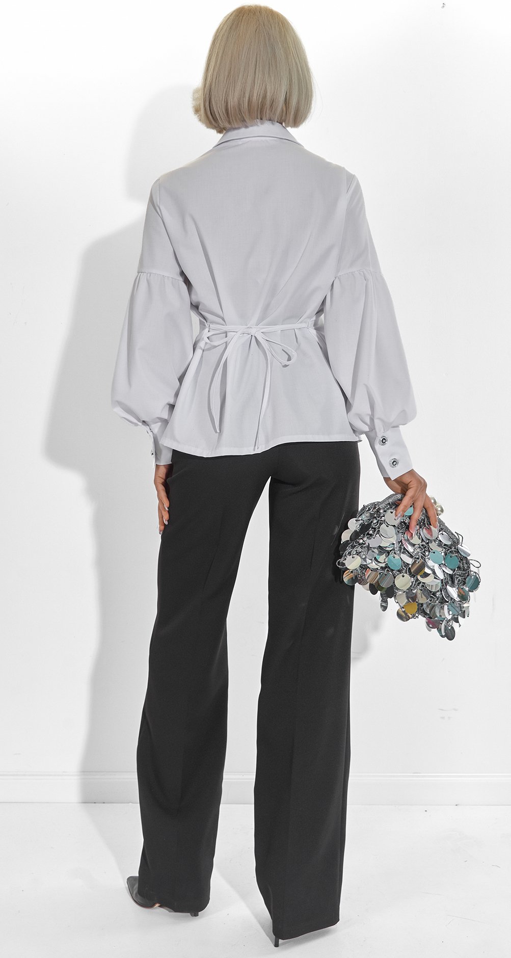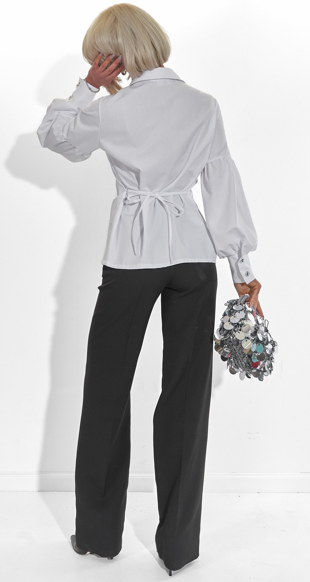 Ми пропонуємо поєднати цю блузу з нашими шовковими брюками пліссе білого кольору. Це поєднання фактур – матової сорочки та сяючого пліссе – створює образ неймовірної розкоші та легкості.