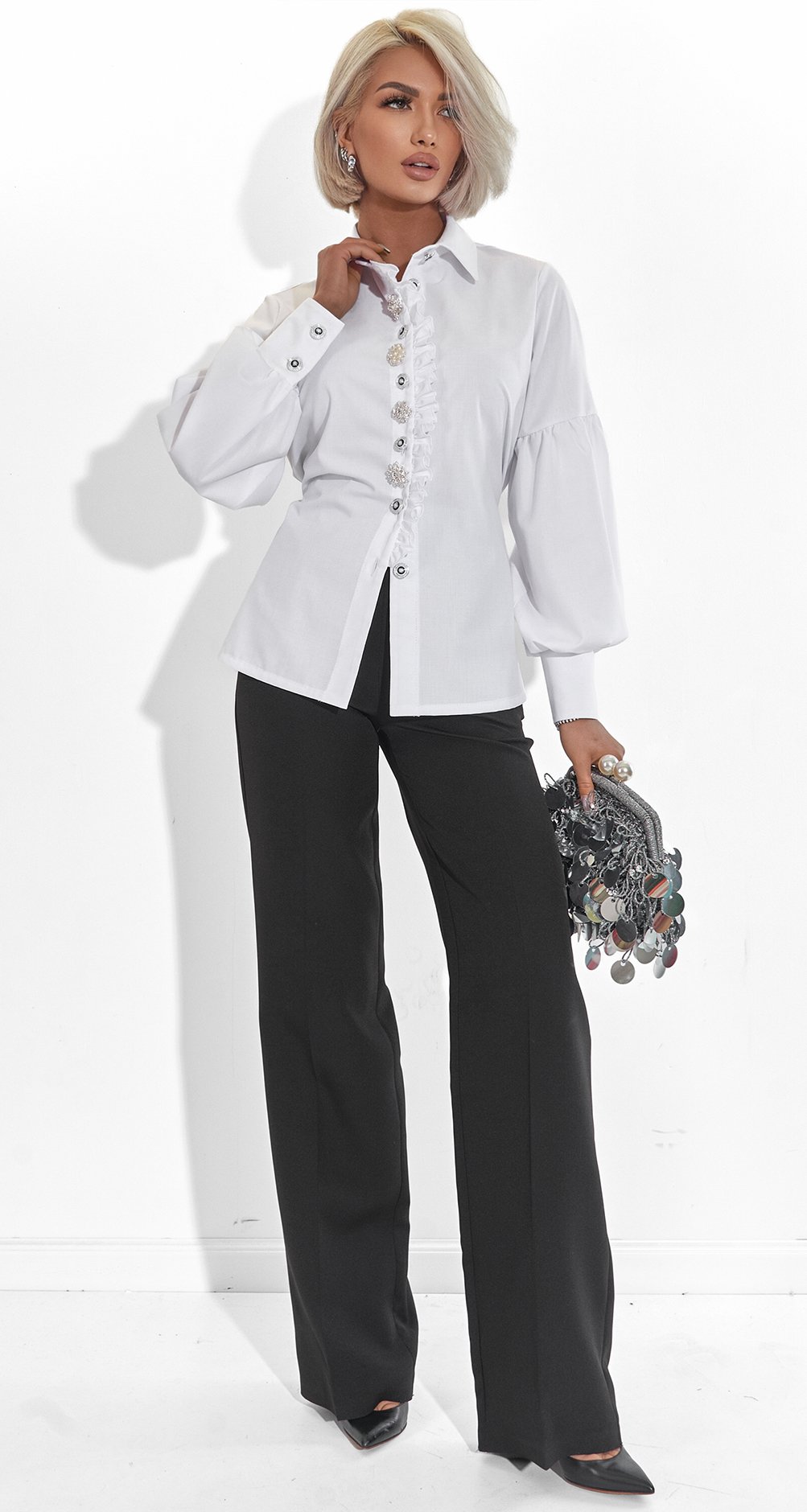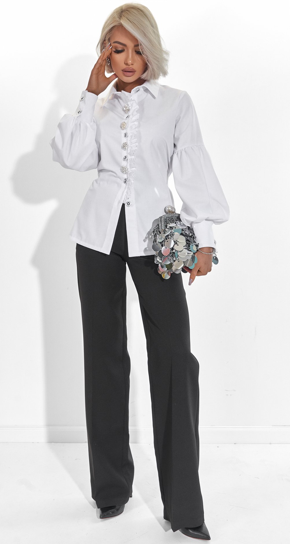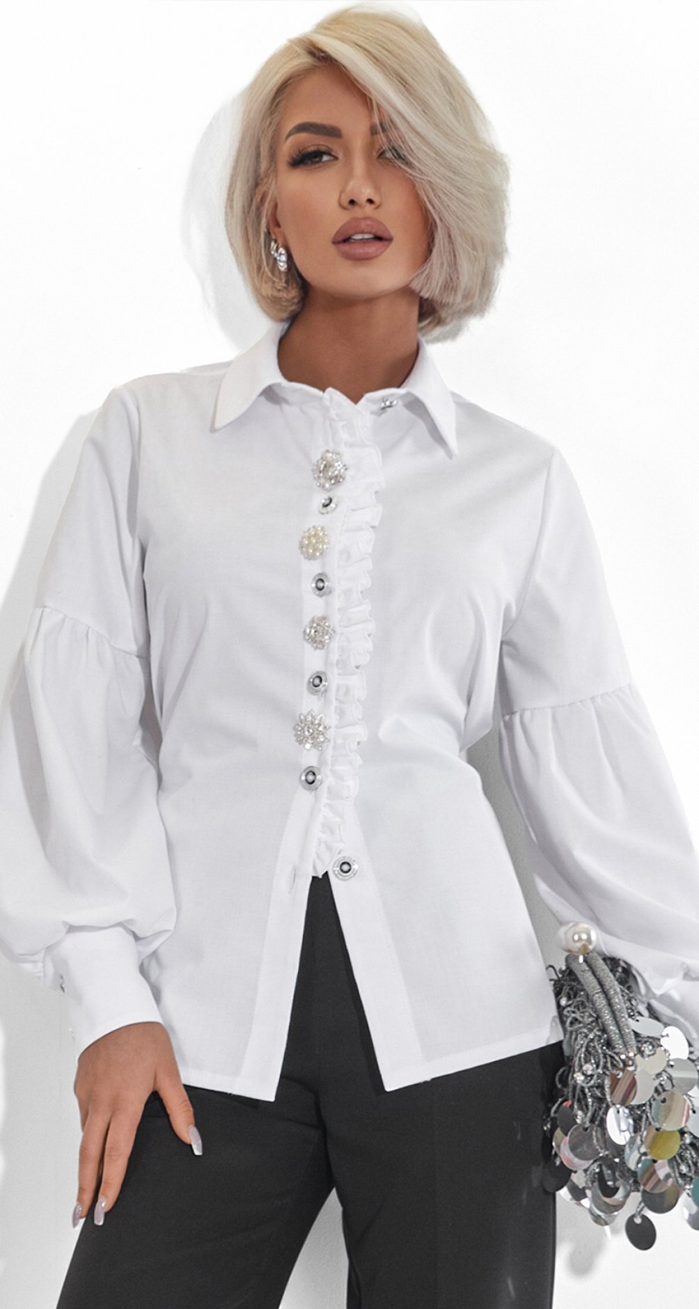 Ця блуза-сорочка – справжній ювелірний виріб у гардеробі. Поєднання натуральних матеріалів та акцентного декору робить її ідеальним рішенням для тих, хто цінує стиль smart luxury.