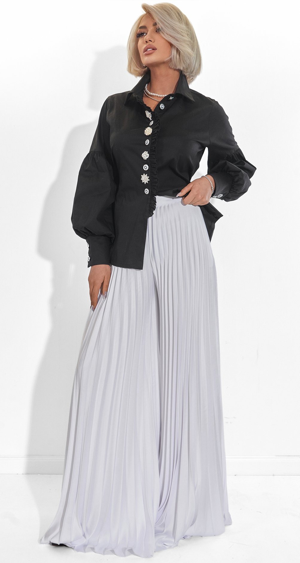 Ми пропонуємо поєднати цю блузу з нашими шовковими брюками пліссе білого кольору. Це поєднання фактур – матової сорочки та сяючого пліссе – створює образ неймовірної розкоші та легкості.