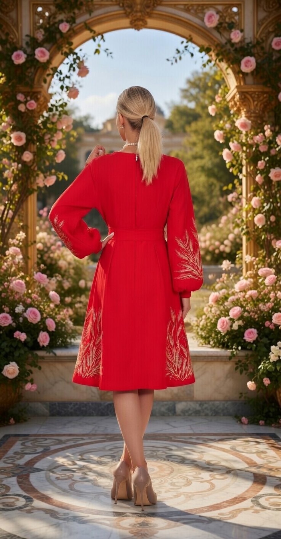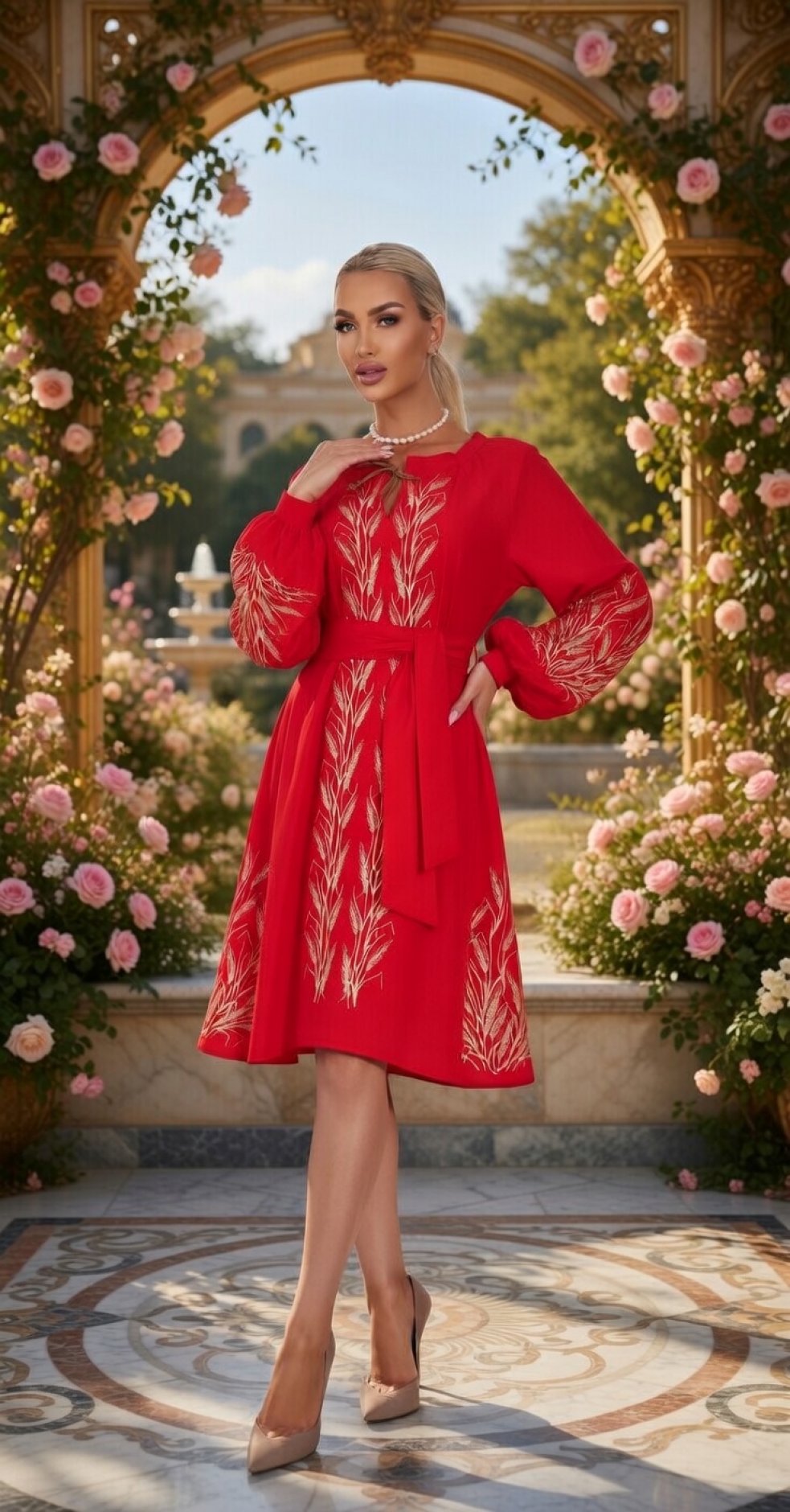 * Вишукана вишивка: Сукня прикрашена золотистою вишивкою у вигляді колосків, що символізує багатство і родючість.