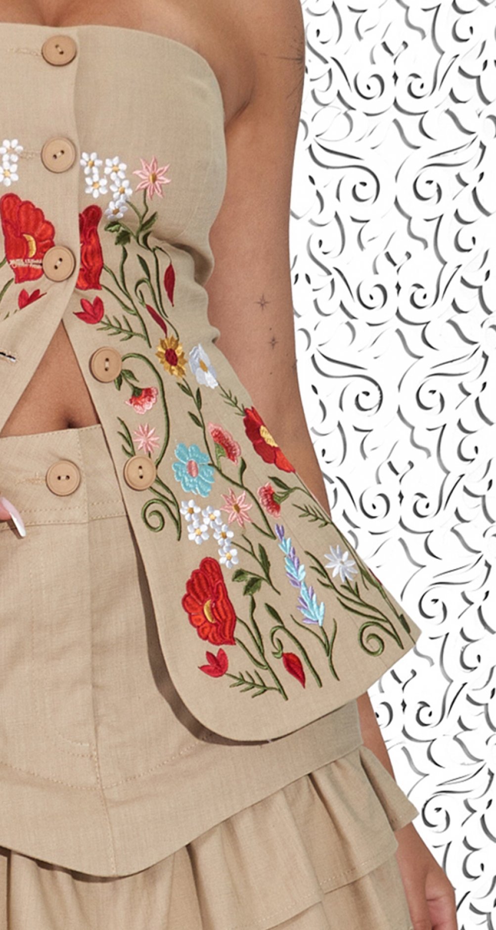 Акцент: Головна особливість - яскрава квіткова вишивка, яка надає образу неповторного етнічного і романтичного шарму. Вишивка виконана у техніці, що нагадує ручну роботу.