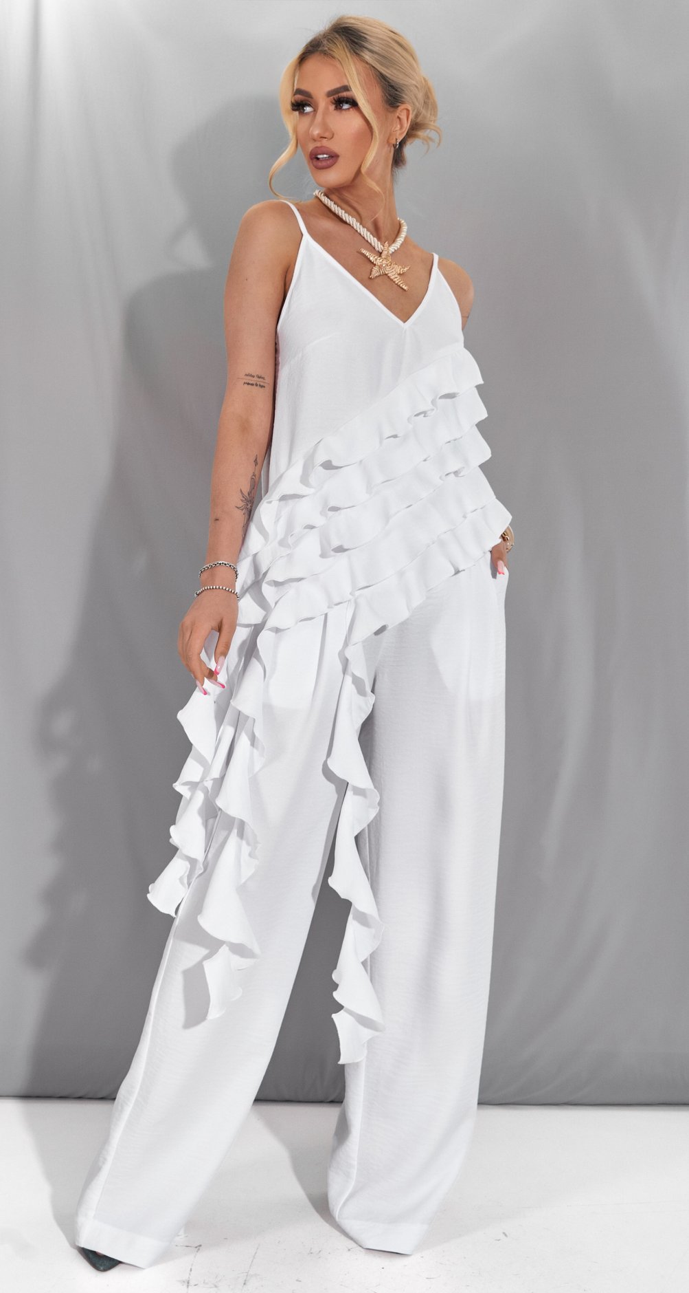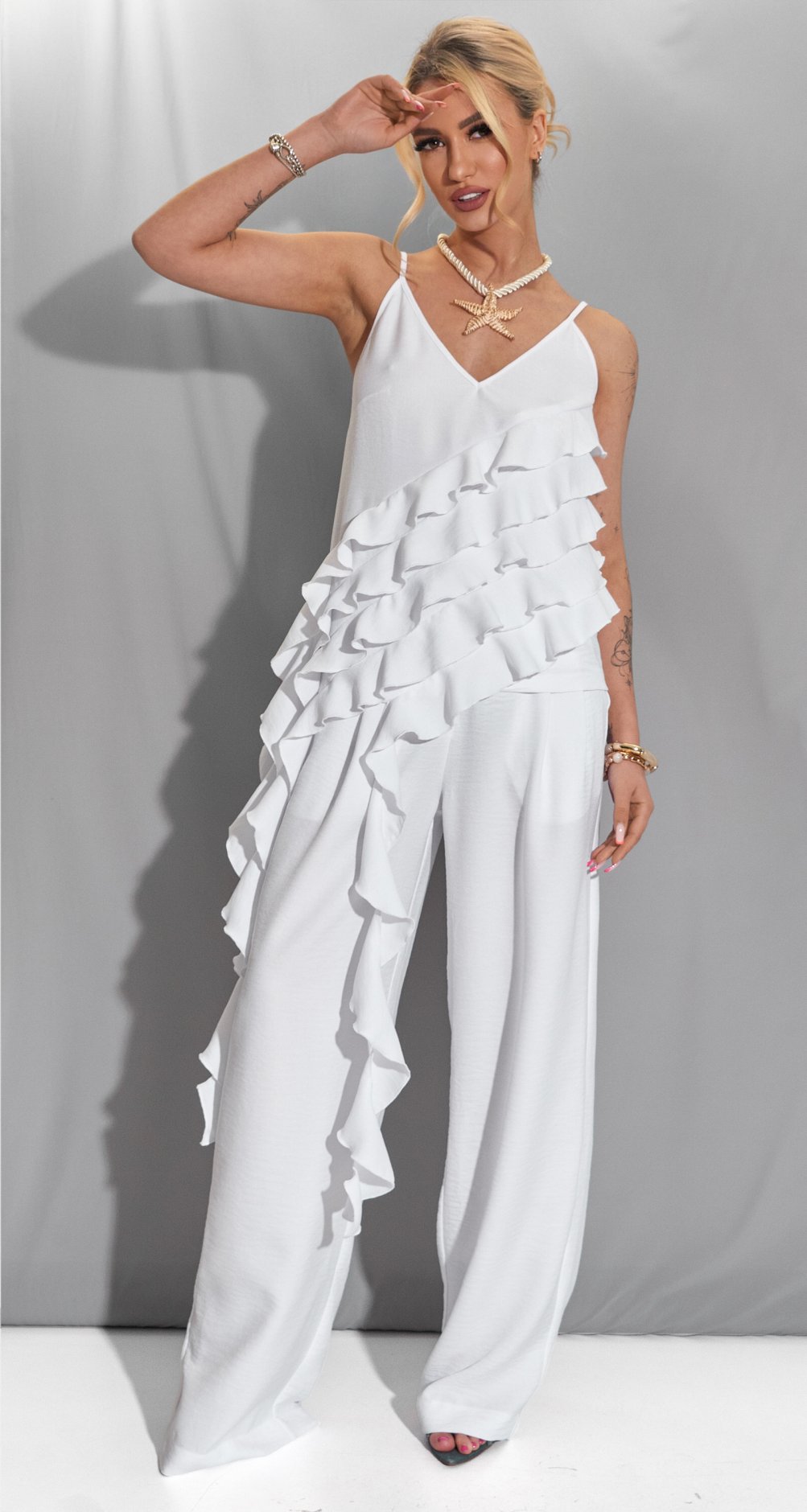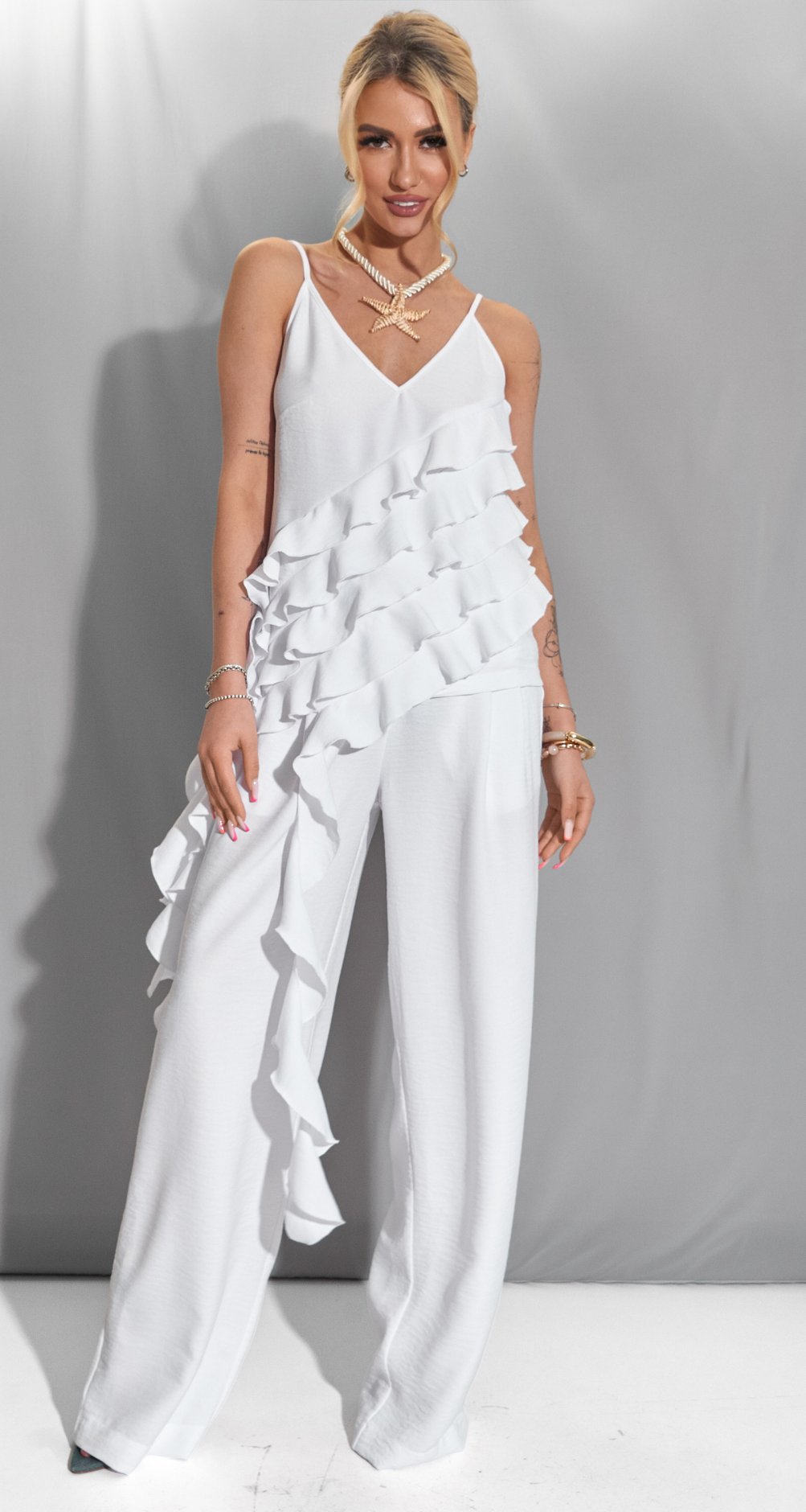 Повітряний топ з каскадом ніжних воланів додасть вашому образу романтичності та жіночності, м'яко струмуючи при кожному русі. Широкі штани-палаццо, немов шовковий вітер, подарують вам неймовірний комфорт та свободу.