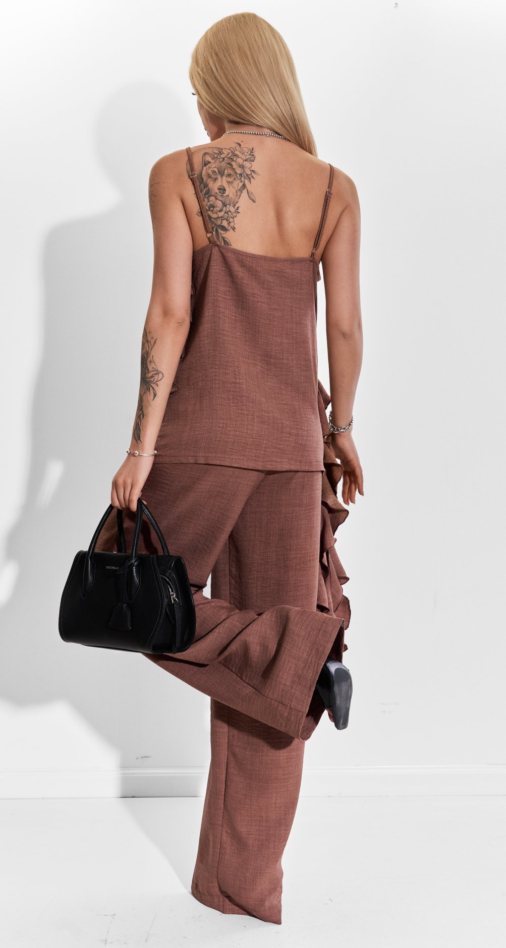Повітряний топ з каскадом ніжних воланів додасть вашому образу романтичності та жіночності, м'яко струмуючи при кожному русі. Широкі штани-палаццо, немов шовковий вітер, подарують вам неймовірний комфорт та свободу.