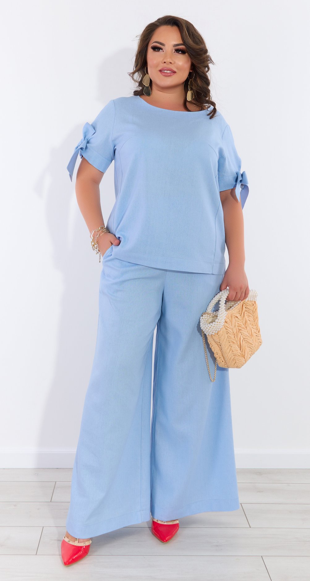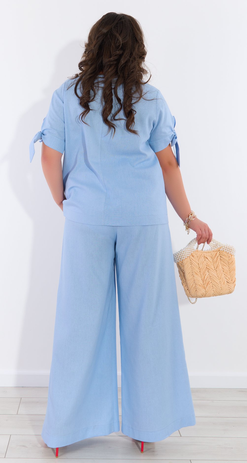 Штани широкі, з високою посадкою, кишенями. Пояс штанів частково на резинці.