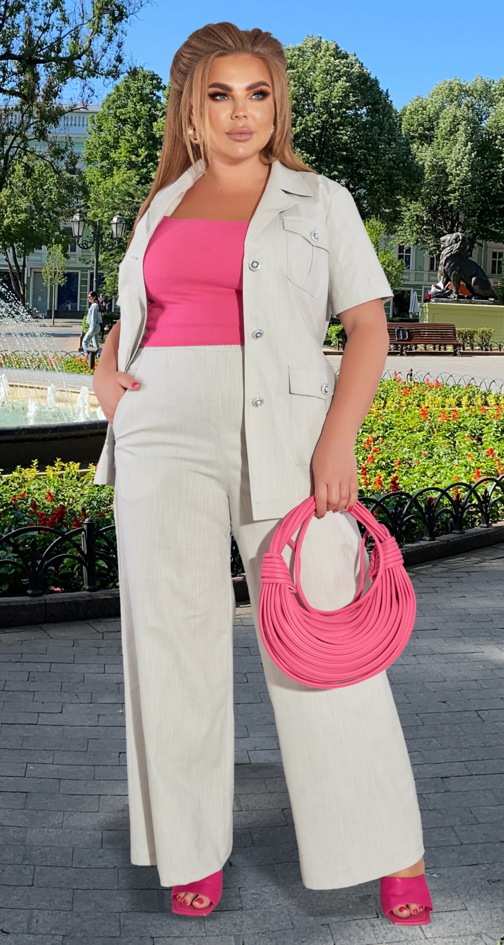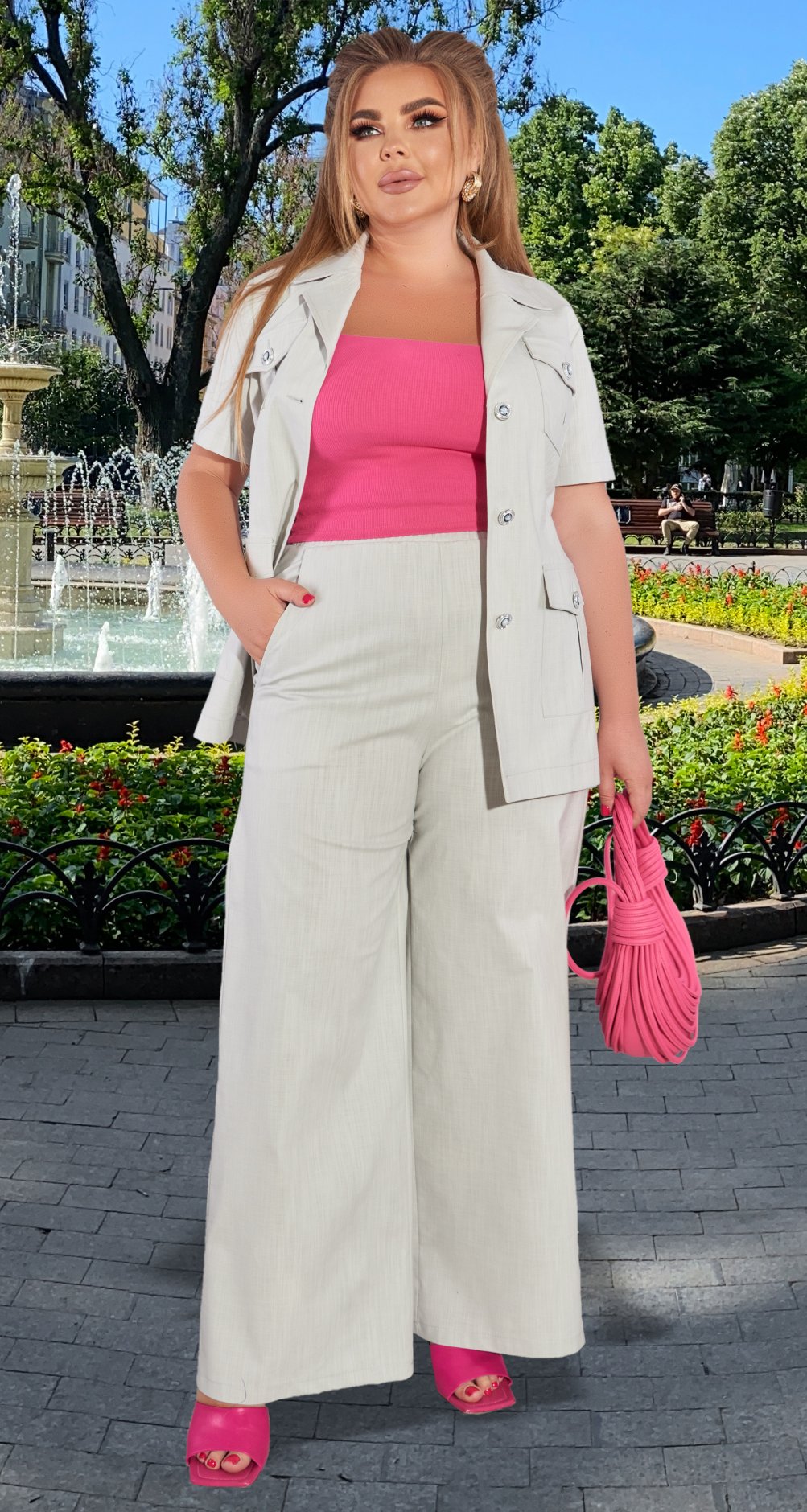 Штани широкі, з високою посадкою, кишенями. Пояс штанів на резинці.