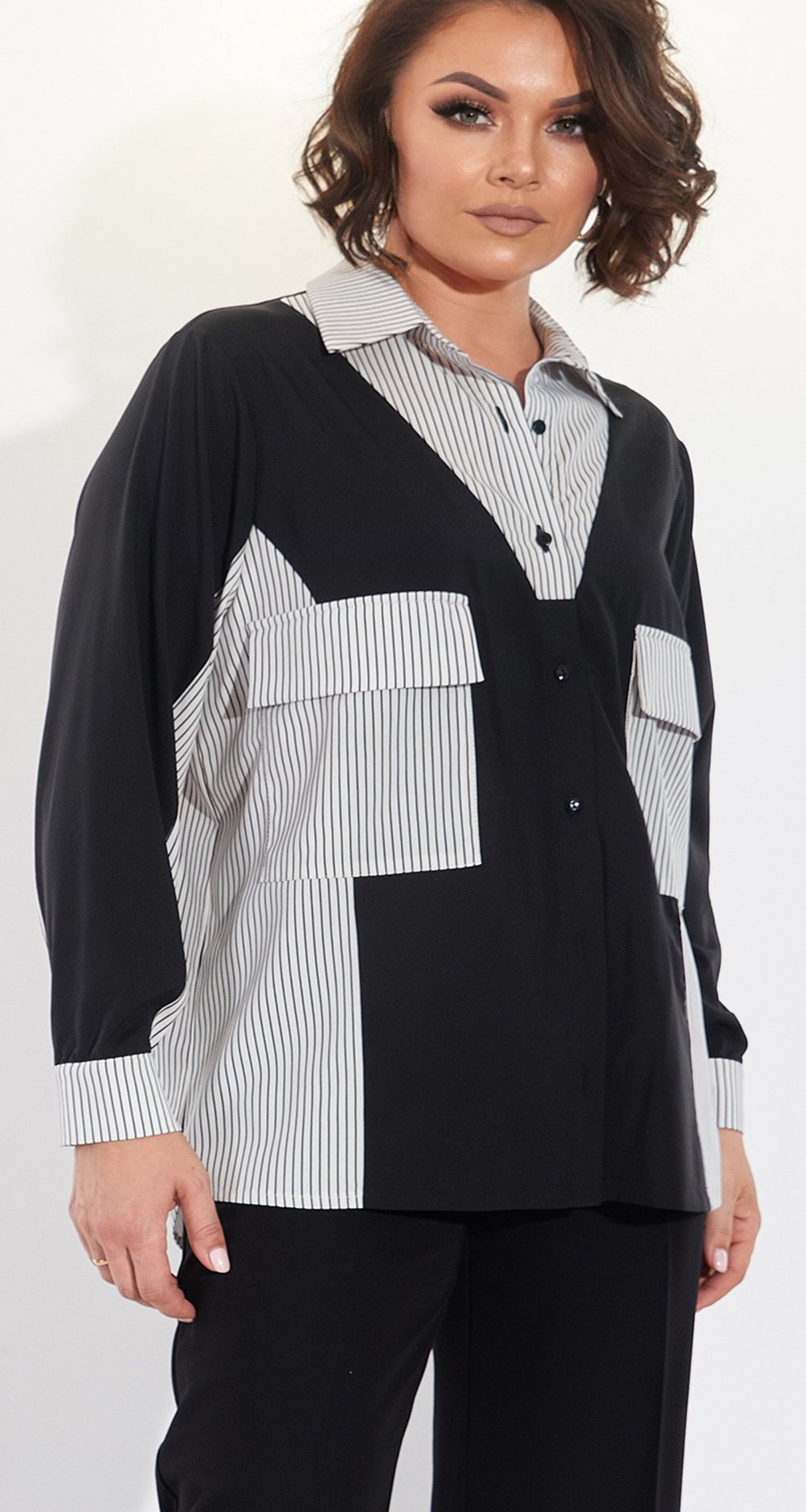 Ця стильна сорочка стане ідеальним вибором для тих, хто цінує комфорт та елегантність. Універсальний чорно-білий дизайн із контрастними вставками створює ефектний образ, який підходить як для офісу, так і для неформальних зустрічей. Вільний крій гарантує зручність, а продумані деталі, такі як смугасті акценти та м'яка тканина, додають вишуканості.