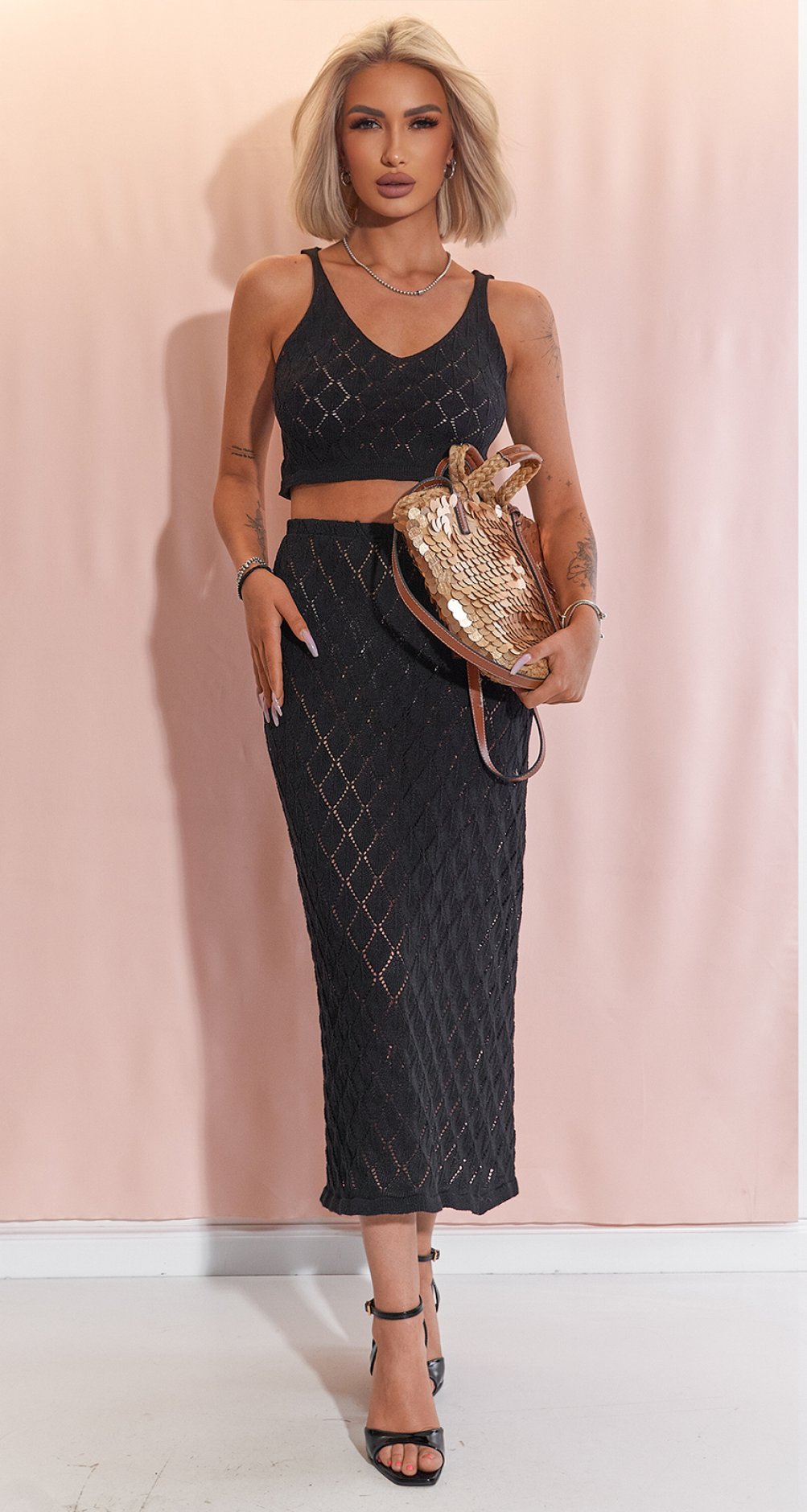 Цей неймовірно стильний в'язаний комплект складається з укороченого топа на бретелях і спідниці міді, виконаних з ажурної, дихаючої бавовни.