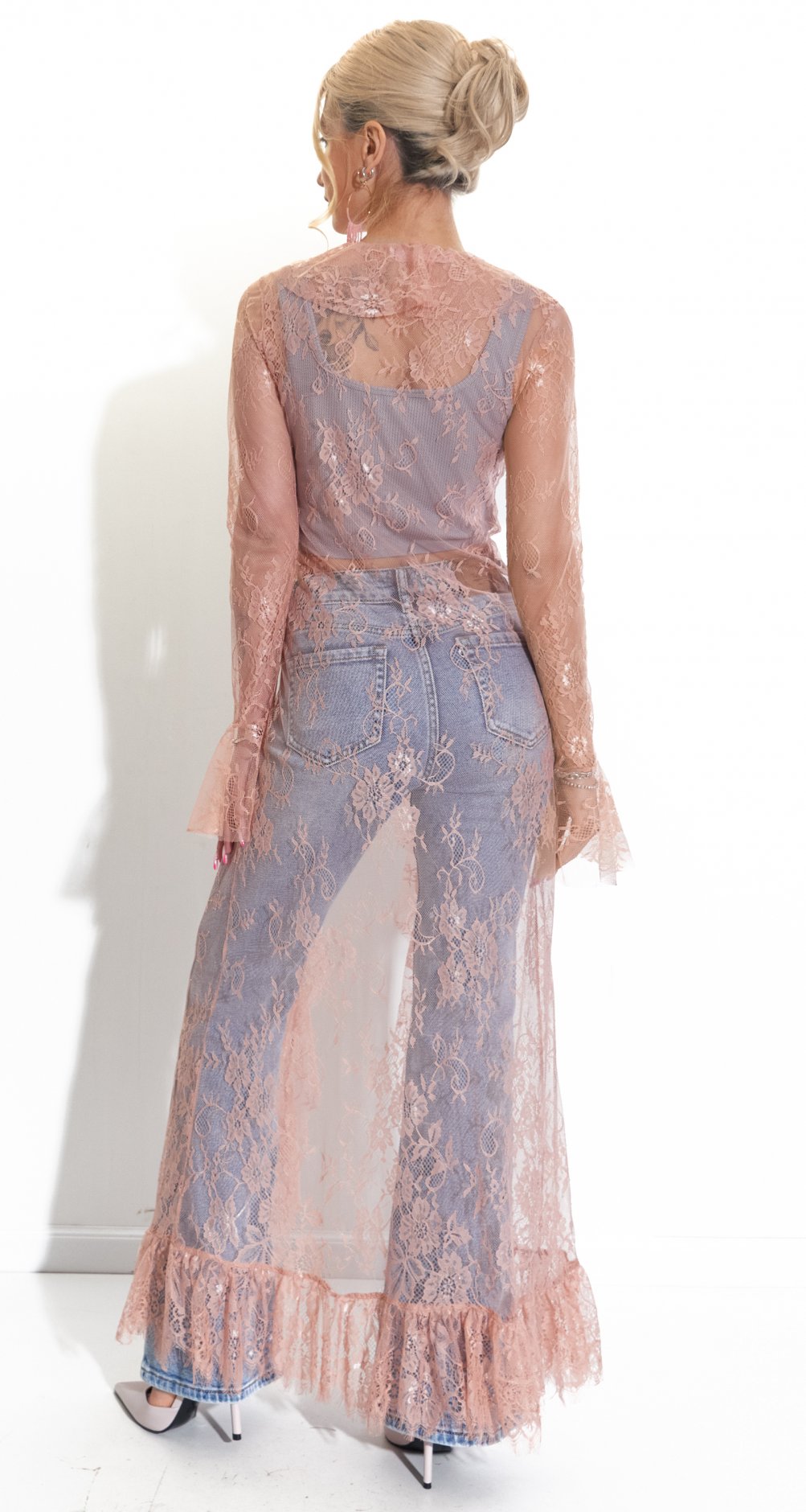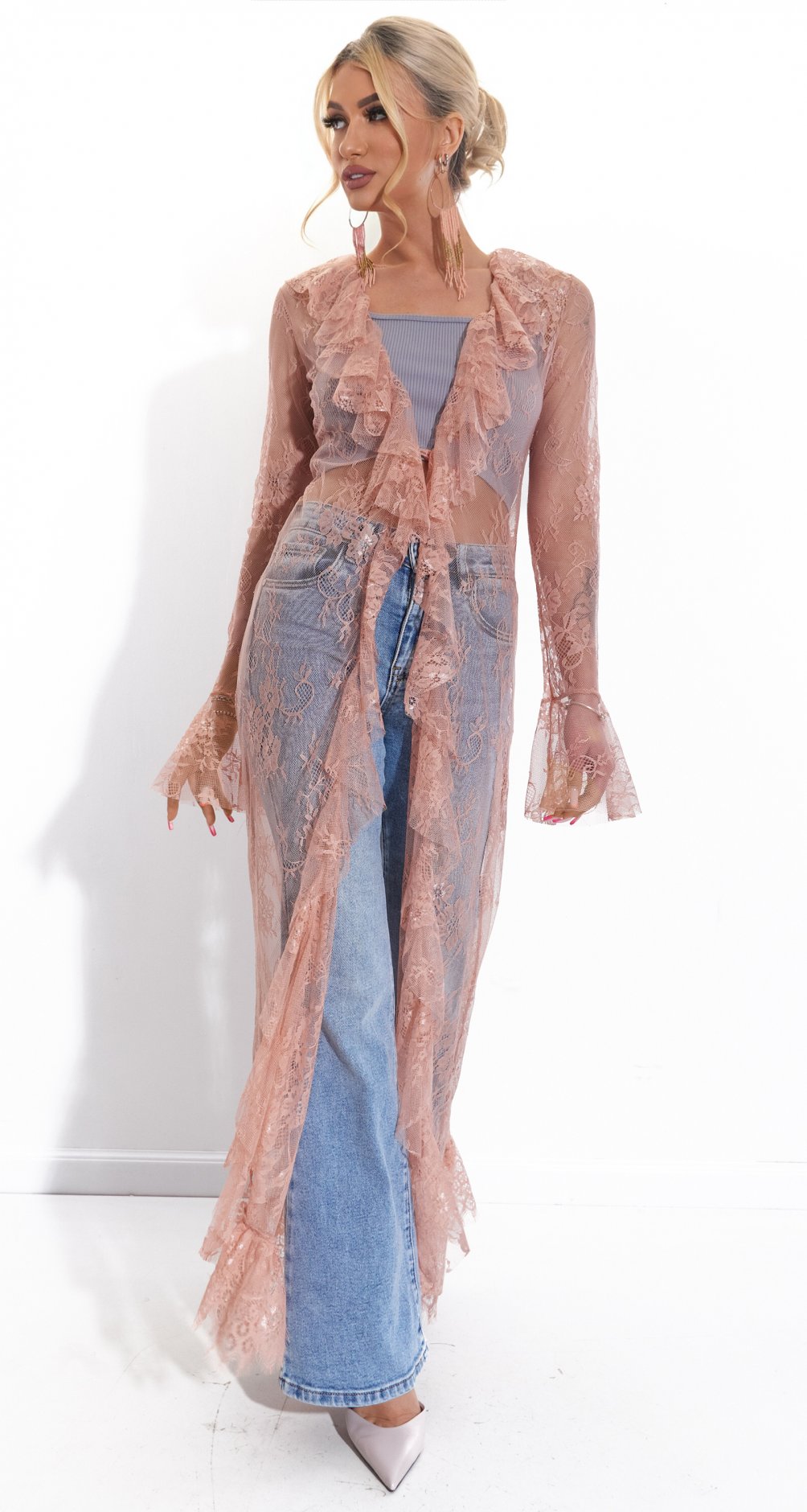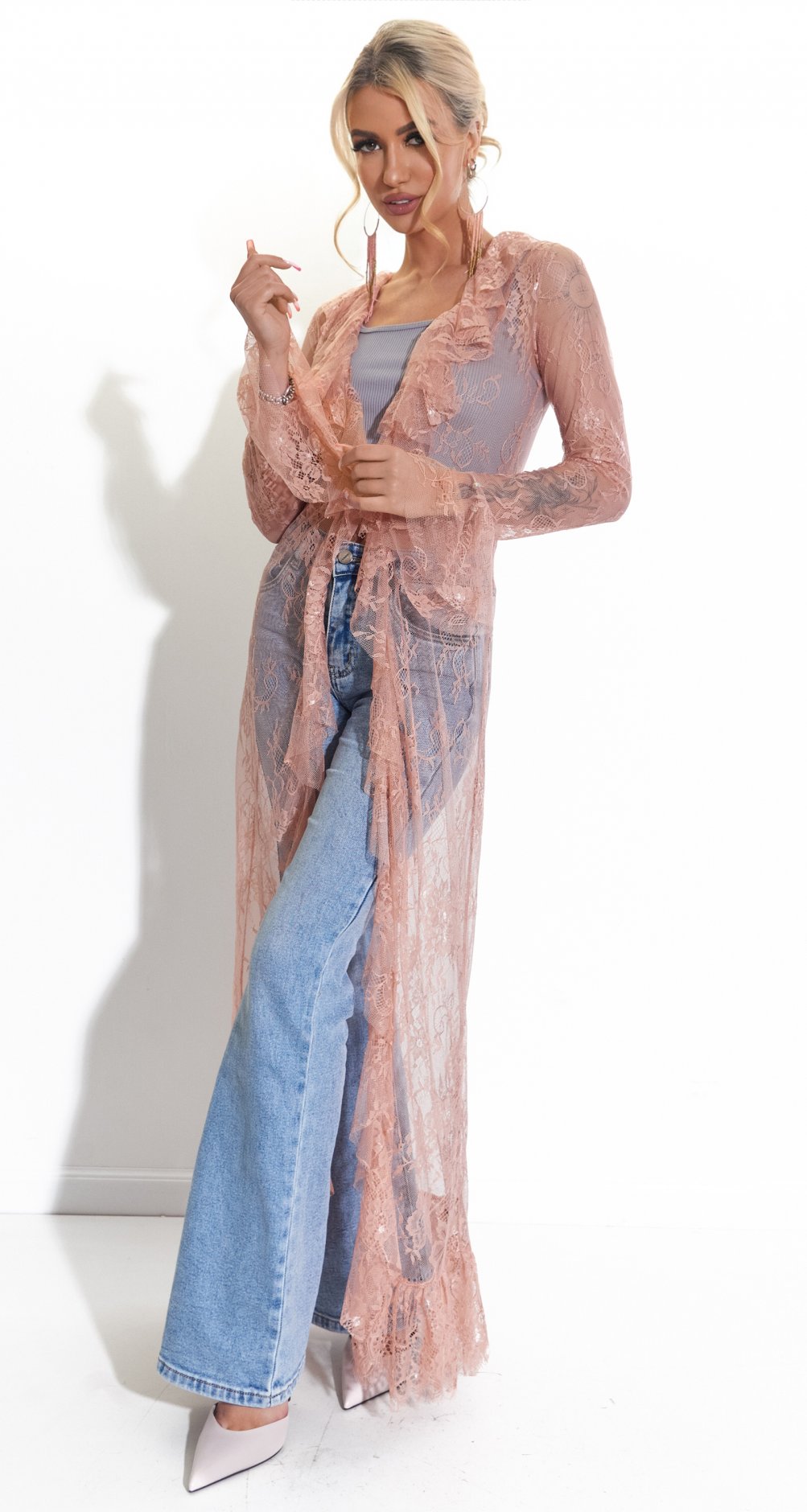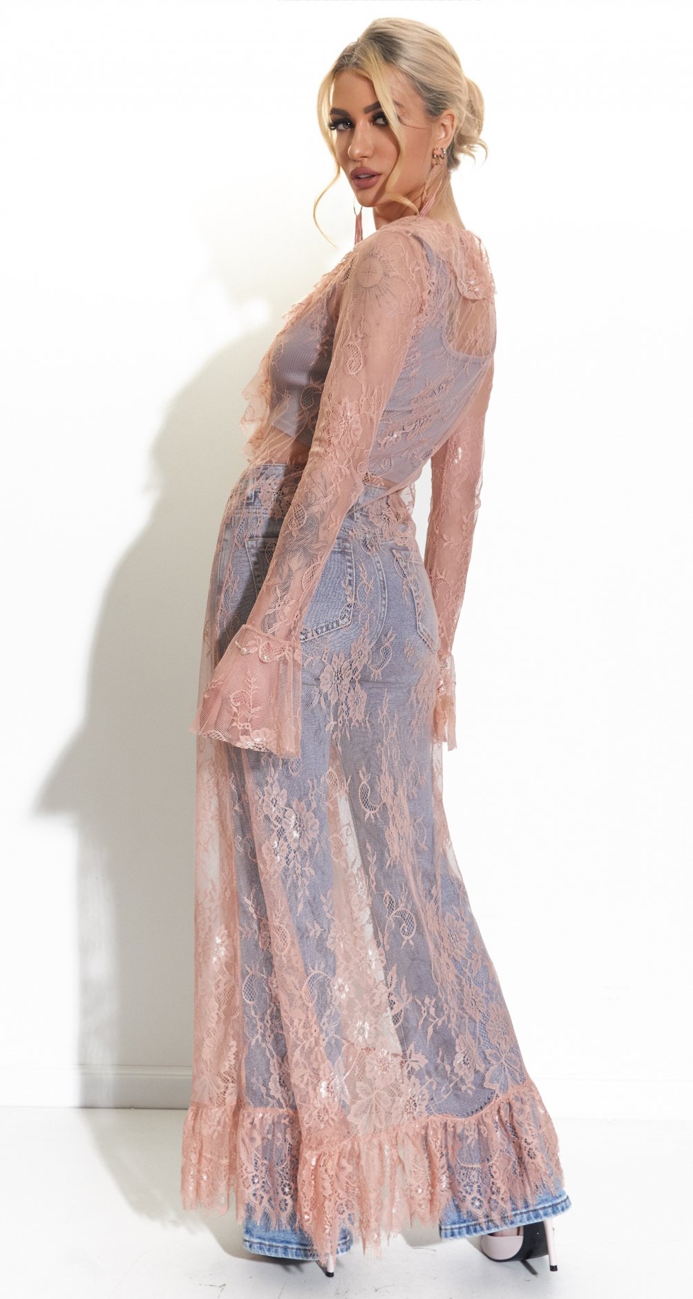 Напівпрозора мережива туніка в пудрово-рожевому відтінку - ідеальний акцент для романтичного та зухвалого образу одночасно. Гра світла, рюші та витончений крій створюють ефект вау при кожному русі. Носи з джинсами, шортами чи купальником — і щоразу будь різною, але завжди незабутньою.