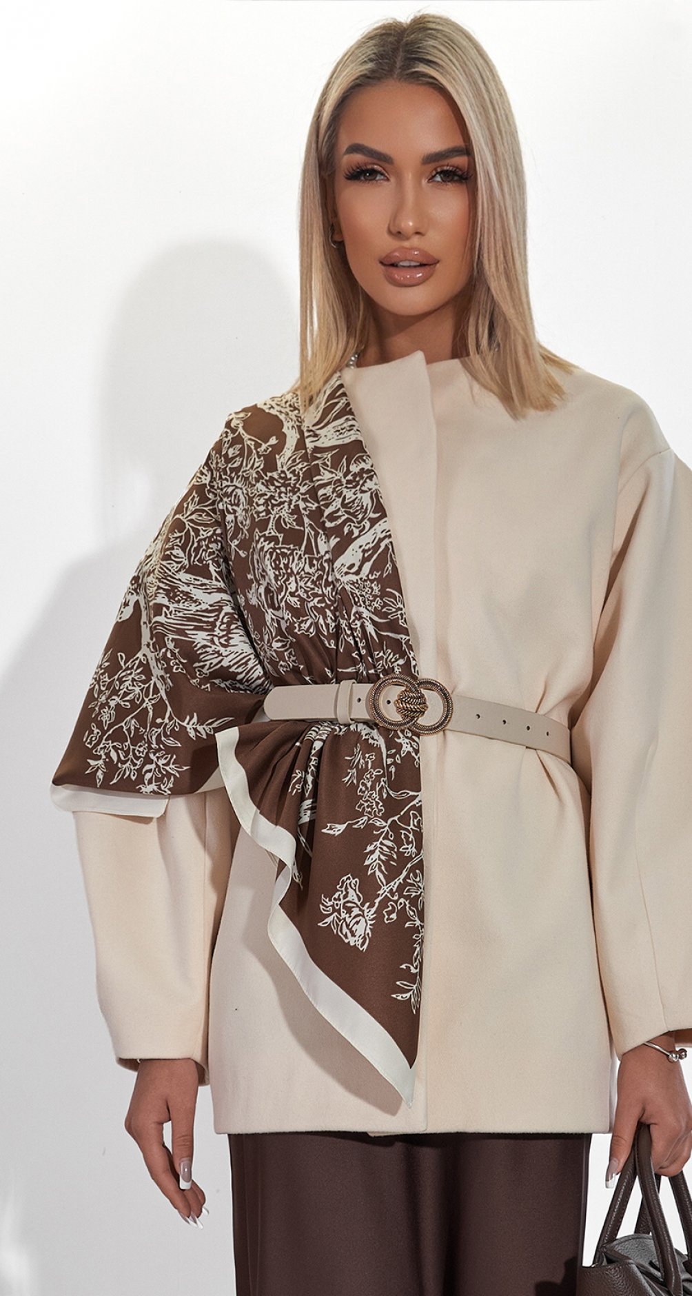 Динамічний Акцент: Ідеальне поєднання стриманого бежевого і глибокого коричневого в принті дозволяє хустці стати яскравим і гармонійним акцентом одночасно (як на фото, де він зав'язаний поверх жакета та пояса).