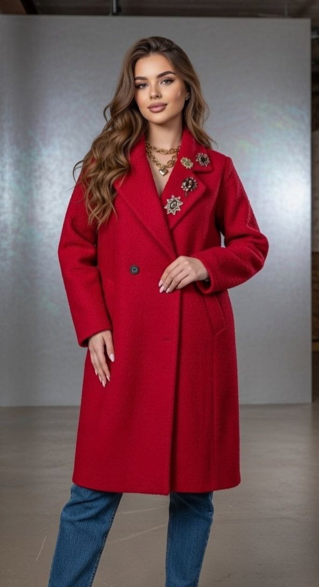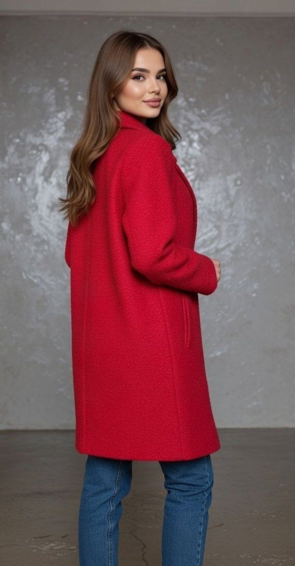 ‚Відчуйте м'якість шкірного дотику. Наше нове червоне пальто з букле створене для тих, хто не боїться бути в центрі уваги. Вільний силует надає образу легкої невимушеності, а фактурна тканина забезпечує максимальний комфорт навіть у вітряну погоду.