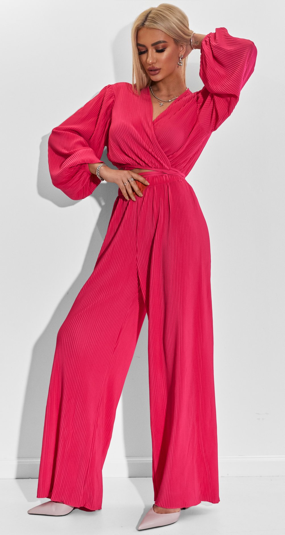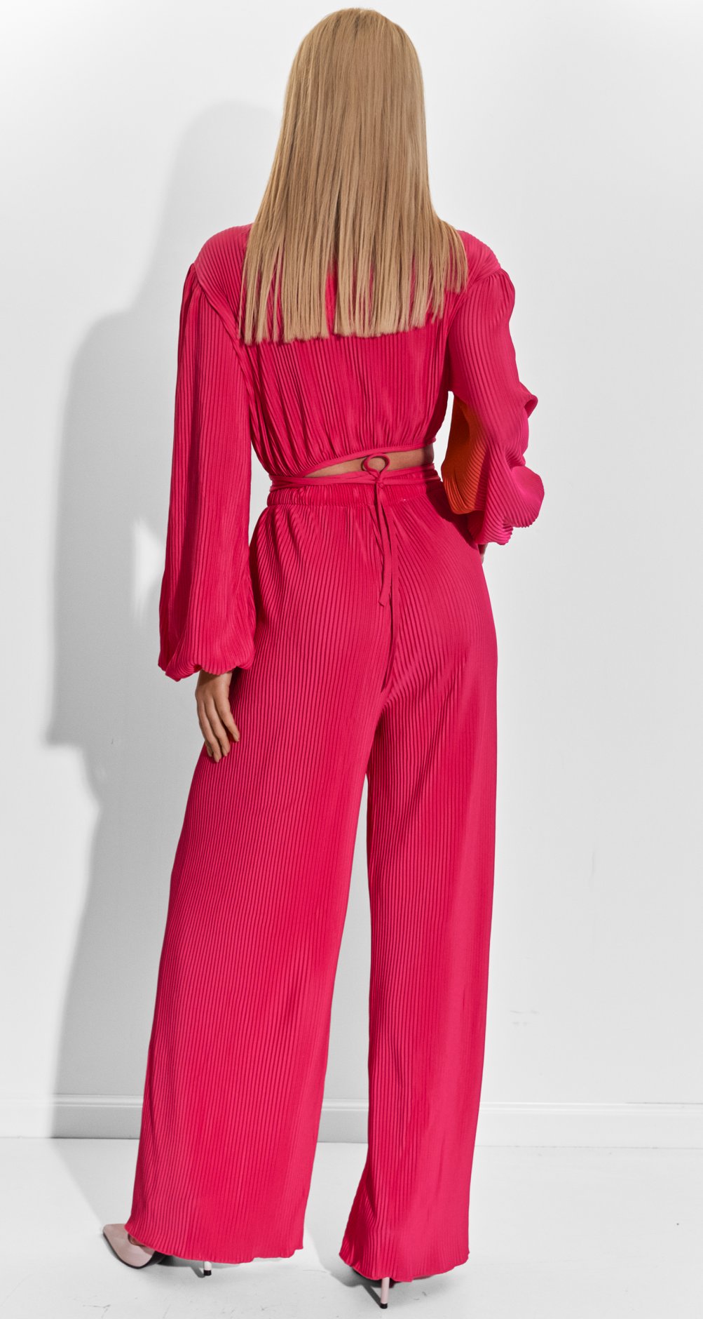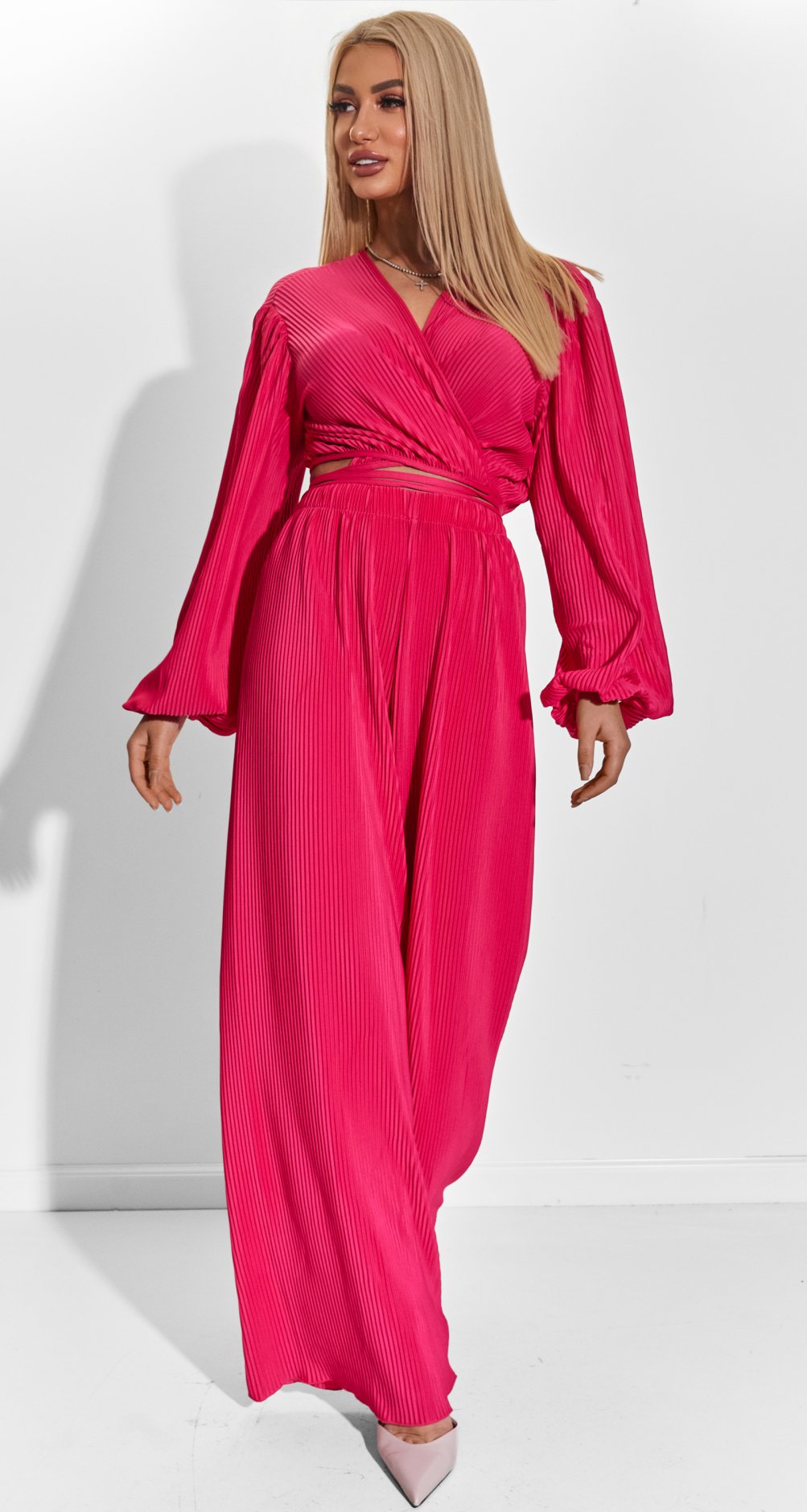 Цей комплект, що складається з елегантного укороченого топу із запахом та широких штанів, створює неймовірно жіночний та витончений образ. М'яка плісирована тканина ніжно обволікає фігуру, даруючи відчуття легкості та свободи рухів.