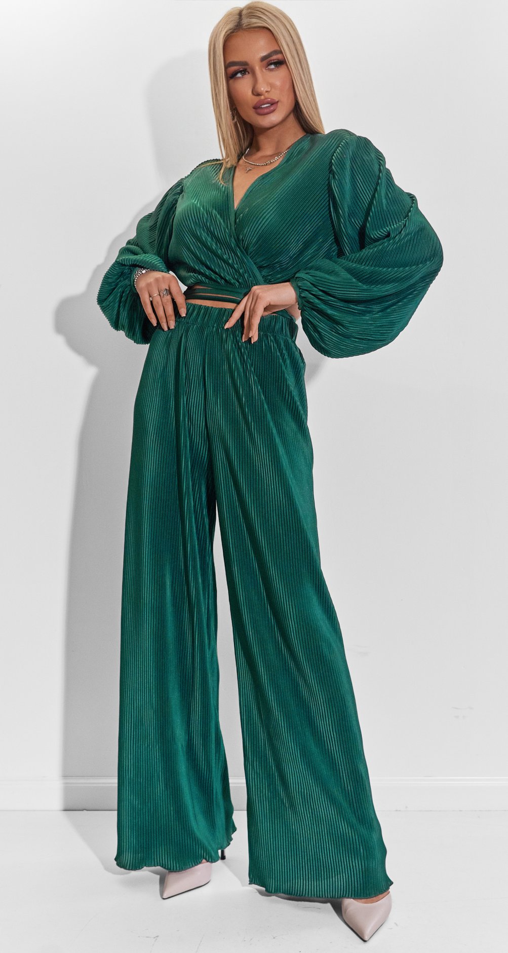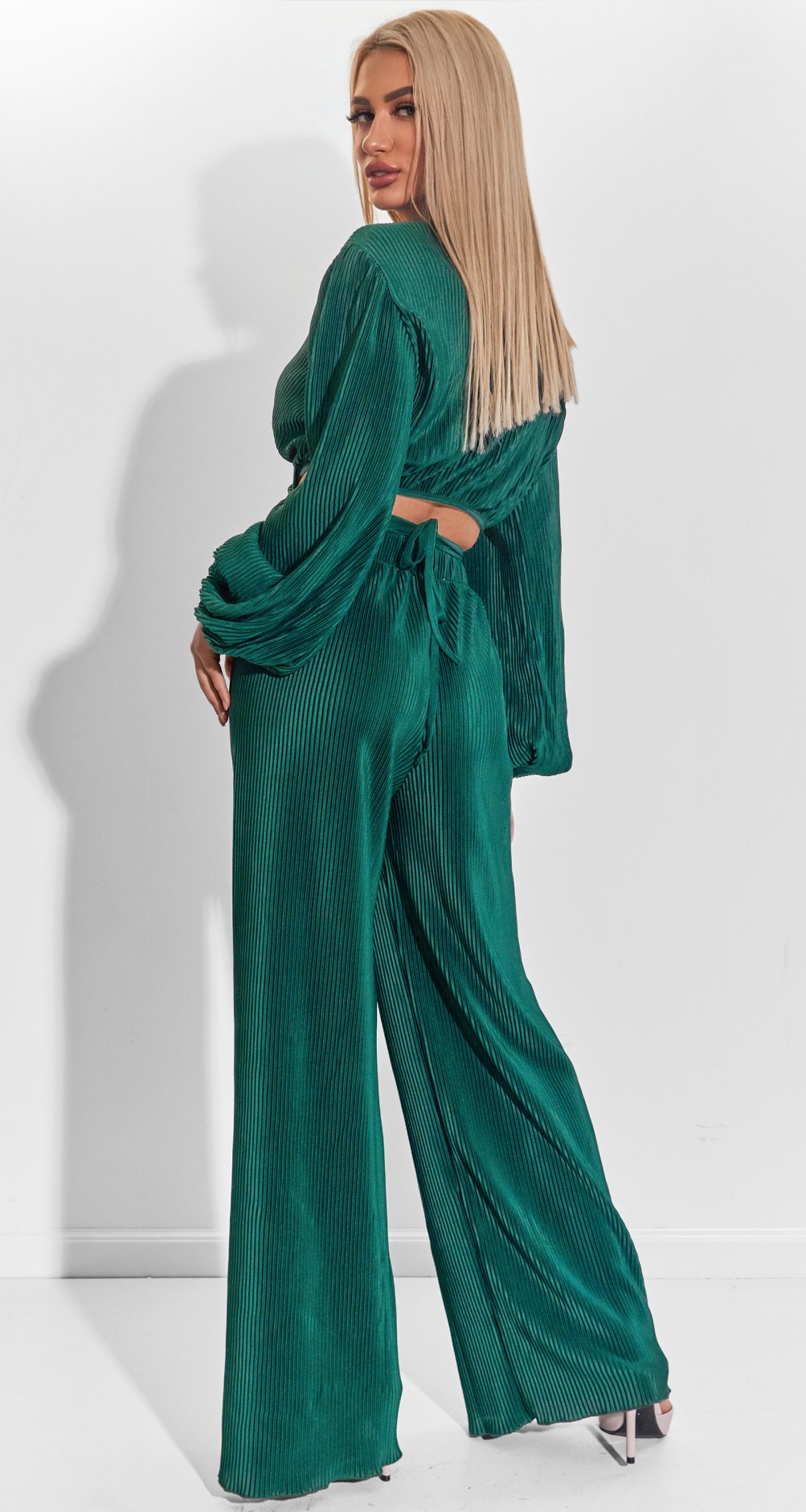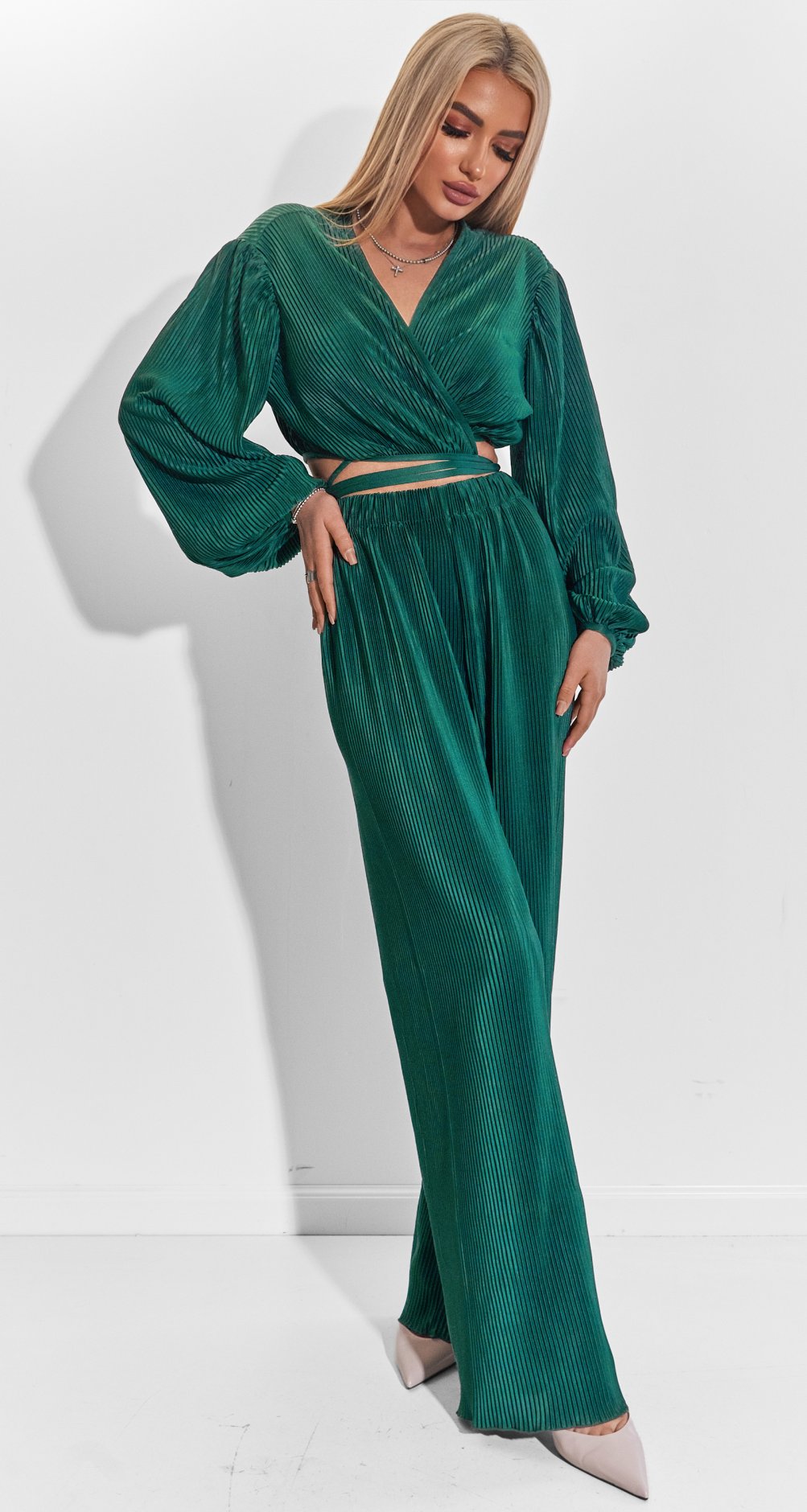 Цей комплект, що складається з елегантного укороченого топу із запахом та широких штанів, створює неймовірно жіночний та витончений образ. М'яка плісирована тканина ніжно обволікає фігуру, даруючи відчуття легкості та свободи рухів.