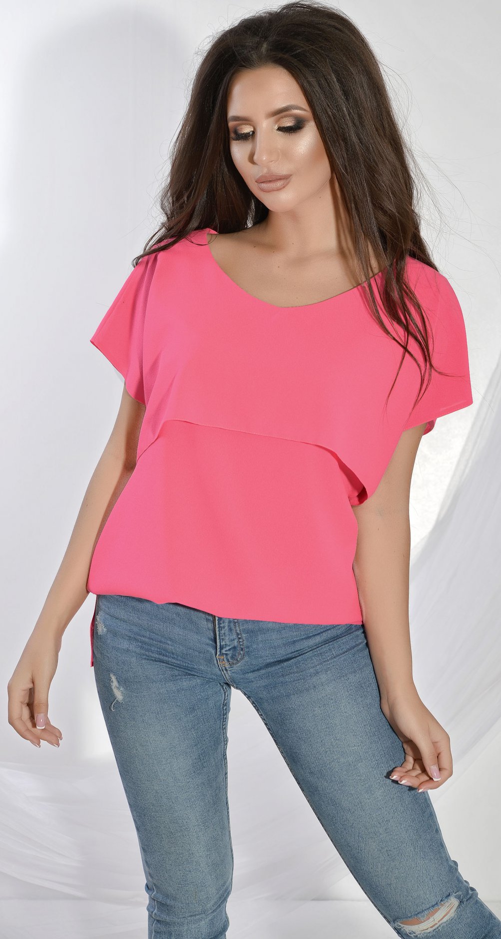 Блуза вільного крою з оборкою та подовжена ззаду.