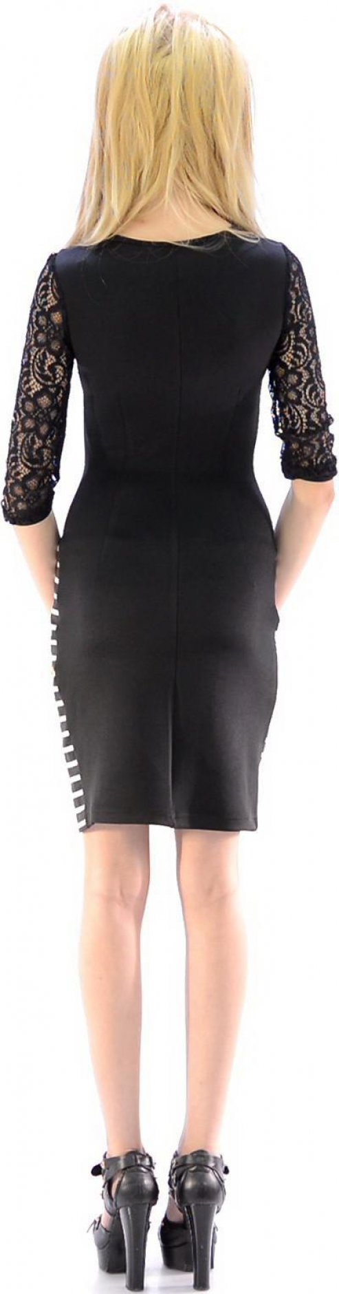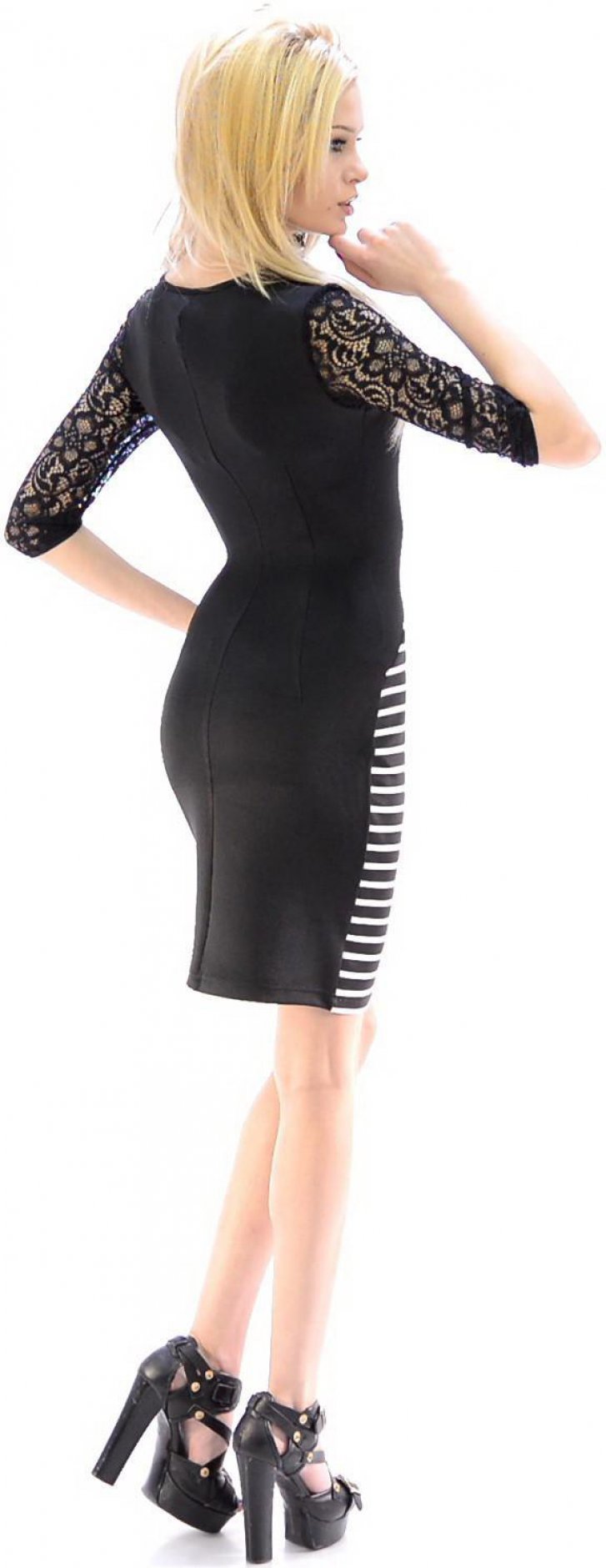Чорне плаття в горизонтальну білу смужку попереду з гіпюровим верхом.