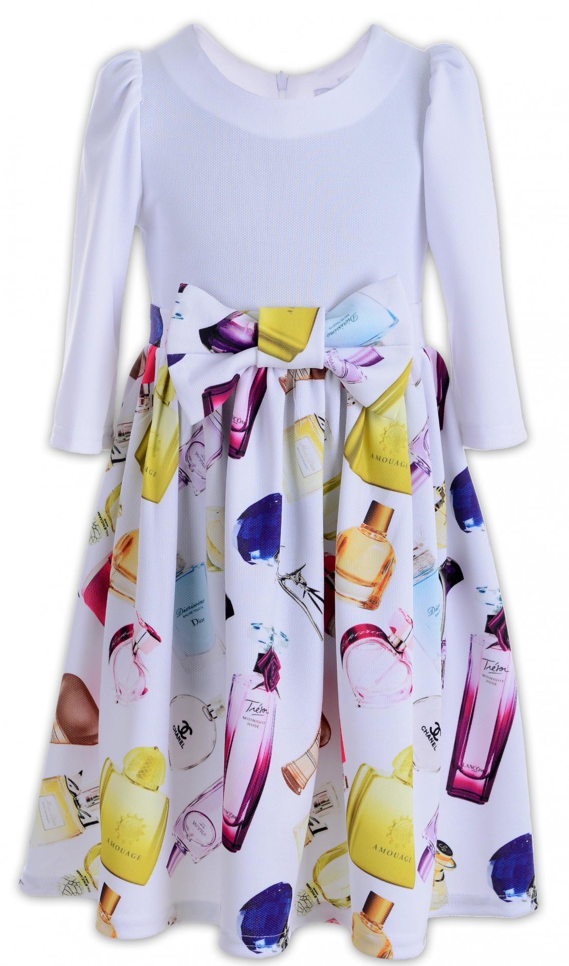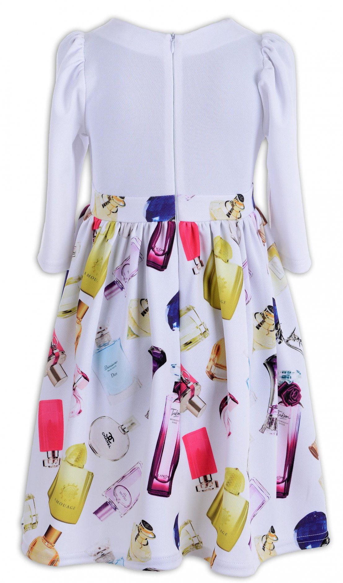 Модна сукня для дівчинки білого кольору з кольоровими флаконами парфумів.